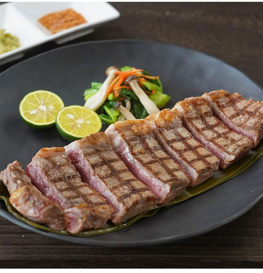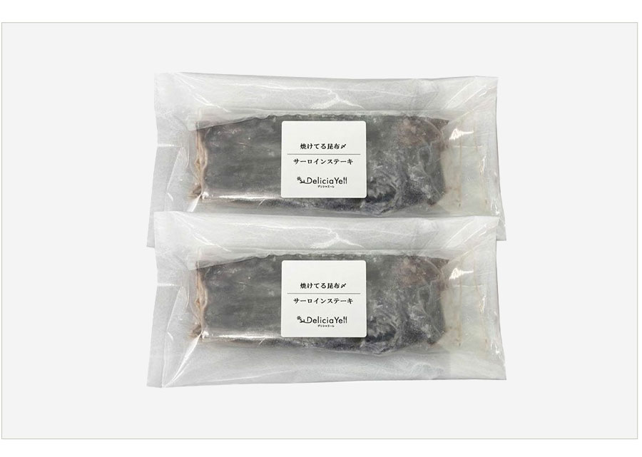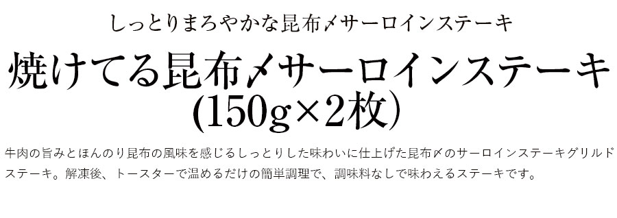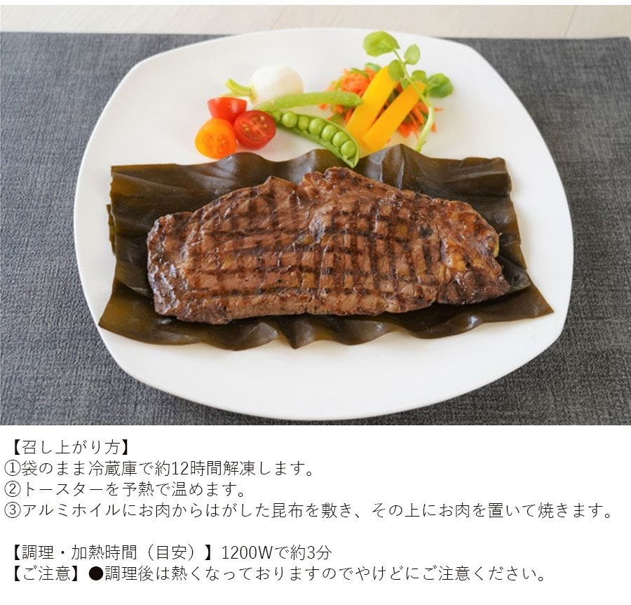 牛肉の旨みとほんのり昆布の風味を感じるしっとりした味わいに仕上げた昆布〆のサーロインステーキグリルドステーキ。解凍後、トースターで温めるだけの簡単調理で、調味料なしで味わえるステーキです。