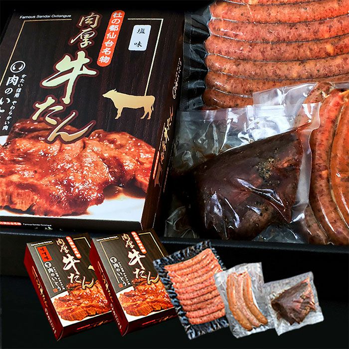 ○名称:牛たん三昧セット ○内容量:肉厚牛たん塩味(300g)×1、肉厚牛たん味噌味(300g)×1、牛たん入りソーセージ(黒胡椒入り・10本入り)300g、牛たんソーセージ(バジル・チョリソー・チーズの3種)90g、ロースト牛たん(130~150g) ○原材料名:【牛たん塩味】牛タン(米国産)、食塩、コショウ/調味料(アミノ酸等)(原材料の一部に牛肉を含む) 【牛たん味噌味】牛タン(米国産)、調味みそ、米みそ、酒、醤油、砂糖、塩、こしょう/調味料(アミノ酸等)、着色料(紅麹、カラメル、パプリカ色素)、酸味料、酸化防止剤(ビタミンC)、増粘剤(キサンタン)、(原材料の一部に小麦・大豆・牛肉、りんご・ごまをむ) 【牛たんソーセージ(10本入り)】牛タン、豚肉、乳清たん白、水あめ、食塩、香辛料、砂糖/リン酸塩(Na)、調味料(アミノ酸)、保存料(ソルビン酸K)、酸化防止剤(V.C)、発色剤(亜硝酸Na)、(原材料の一部に乳成分を含む) 【牛たんソーセージ(3種)】牛タン、豚肉、乳たん白、糖類(水あめ、砂糖)、チーズ、食塩、香辛料、バジル/リン酸塩(Na)、調味料(アミノ酸)、保存料(ソルビン酸)、酸化防止剤(V.C)、発色剤(亜硝酸Na)、(原材料の一部に乳成分を含む) 【ロースト牛たん】牛たん(輸入)、食塩、香辛料、ブドウ糖(原材料の一部に牛肉を含む) ○配送形態:冷凍 (宅配BOX・置配不可) ○保存方法:冷凍 ○賞味期限:製造日より 180 日 ○熨斗:可 ○名入れ:可 ○包装:可 ○手提げ:不可 ○荷姿:化粧箱 ○備考: ○製造者:【WIDEFOOD株式会社】 〒980-0813 宮城県仙台市青葉区米ケ袋1-6-8 <おすすめ用途> 自宅用 手土産 お歳暮 お年賀 お中元 敬老の日 ギフト プレゼント 贈り物 お礼 お返し ご挨拶 結婚祝 内祝い 誕生日 卒業 <贈る相手> 女性 男性 友人 家族 祖母 祖父 孫
