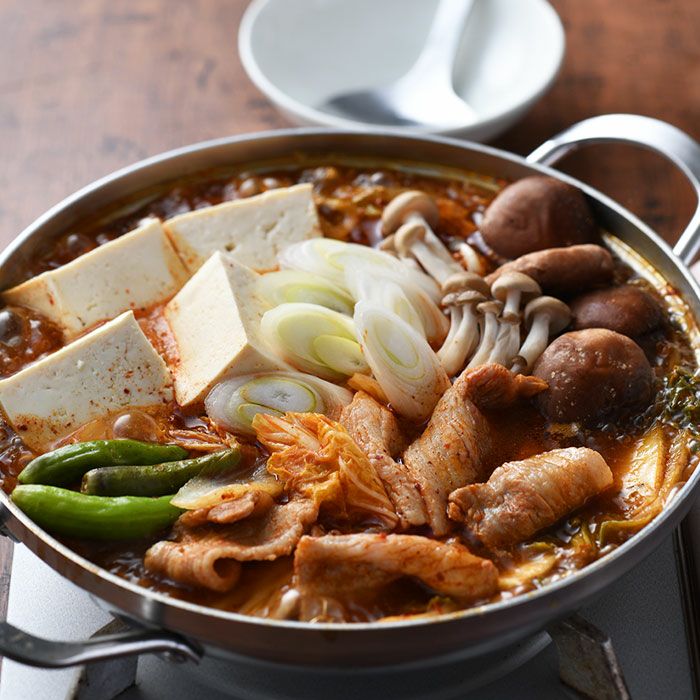 白菜キムチに豚バラ肉、豆腐や野菜まで付く、盛岡冷麺の名店によるキムチ鍋セット。辛味噌やニンニクが織りなすヤンニョムで仕上げたスープが味の要だ。旨みたっぷりだが、白菜キムチの爽やかな酸味が加わると、後味は意外にもすっきり。品のよい辛さが後をひく。