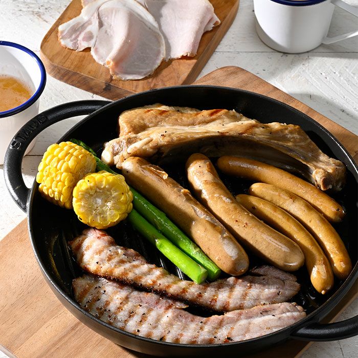 ○内容量:ロースハムスライス70g×1、ベーコンステーキ63g×2、プレーンウインナー(5本)110g×1、フランクフルト(3本)160g×1、燻製スペアリブ(1本)200g×1