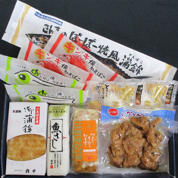 他の画像を見る 貴千のかまぼこ詰合せ【優(ゆう)】 郷土の味からチーズや揚げ物まで素材の旨みを堪能する 貴千のかまぼこ詰合せ【優(ゆう)】 販売価格 ¥ 5,350 税込 いわきの郷土料理「さんまのぽーぽー焼き」をモチーフにしたさんまのぽーぽー焼風蒲鉾、かまぼこの身にキンキ・めひかりを練り込んだ焼かまぼこ、ソフトなかまぼこ生地にチーズを包み込んだ一口大の珍味蒲鉾贅沢チーズ、いかの耳とゲソを唐揚げ粉を混ぜたかまぼこ生地に練り込みピリ辛風に仕上げたいかとゲソの揚げかまぼこ、チーズをたっぷりかまぼこ生地に練り込みサーモンとパセリを混ぜたお酒のおつまみに最適なワインによく合うかまぼこ、澱粉を使用していないのでなめらかでモチっとした食感が特徴の魚さし、はものすり身を使用し両面を香ばしく焼いた錦焼の詰合せです。それぞれの素材の味を存分に堪能できます。魚さしは全国蒲鉾品評会にて「第72回農林水産大臣賞」を受賞しました。 詳細を見る お気に入りに登録する