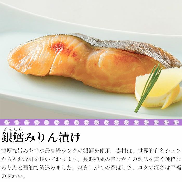 他の画像を見る 【下鴨茶寮】料亭の西京漬け(10切) 料亭の味を自宅で、品の良い甘みと香りの西京漬け 【下鴨茶寮】料亭の西京漬け(10切) 販売価格 ¥ 13,100 税込 海から遠く離れた京都で、魚の保存性を高め、美味しくいただくために生まれた西京漬け。麹が多く塩分が少ないため、品の良い甘みと香りを醸し出す西京白味噌を使用した下鴨茶寮特製の西京味噌漬けです。味噌との相性、味、香り、食感を吟味し、厳選した 銀鮭・からすかれい・銀鱈・金目鯛・さわら・ぶりの6種を、魚介本来の持ち味を生かし風味豊かに仕上げました。深みのある贅沢な魚介をご賞味くださいませ。目上の方への贈り物にもおすすめな専用化粧箱入りです。贈答用としてはもちろん、ご自宅用にも喜んでいただける「料亭の西京漬け」をぜひご賞味ください。 詳細を見る お気に入りに登録する