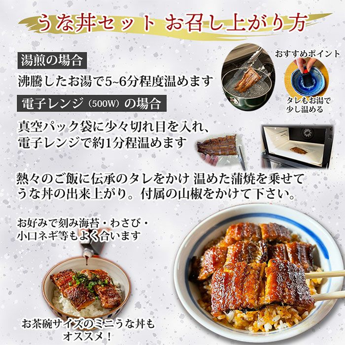 他の画像を見る うな丼用蒲焼セット(3人前)【うなぎの新甫】 手間いらず!時短で完成する専門店の本格うな丼の具 うな丼用蒲焼セット(3人前)【うなぎの新甫】 販売価格 ¥ 10,550 税込 うなぎ専門店のこだわりを尽くした特大肉厚な蒲焼。創業以来守り継ぐ伝統の製法で手作りするタレで香ばしく焼き上げています。うな丼用サイズに蒲焼をカットし、ちょうどうな丼ができる4切を真空パック袋に詰めています。湯煎、もしくは電子レンジで温めていただき、熱々ご飯にタレをかけ、温めた蒲焼を乗せれば、うな丼の出来上がり。包丁いらずで手間なく、時短調理が可能。お茶碗ご飯に2切れ乗せてミニうな丼もおススメ。お好みで小口ネギやわさび、刻み海苔等かけていただくと風味がかわってより一層美味しく召し上がれます。 詳細を見る お気に入りに登録する
