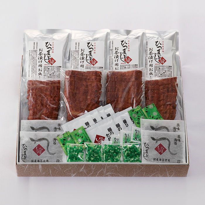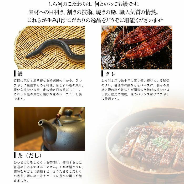 他の画像を見る しら河 ひつまぶし詰合せセット 鰻の老舗の味。ひと箱で三度美味しい本格ひつまぶし しら河 ひつまぶし詰合せセット 販売価格 ¥ 11,800 税込 国産鰻使用です。ご家庭でお手軽に本場名古屋のひつまぶしをお召し上がりいただけるセットです。一膳目はそのまま、二膳目は薬味を添えて、3膳目は薬味を添えお茶漬けでお召し上がりください。3通りの味をお楽しみください。 詳細を見る お気に入りに登録する