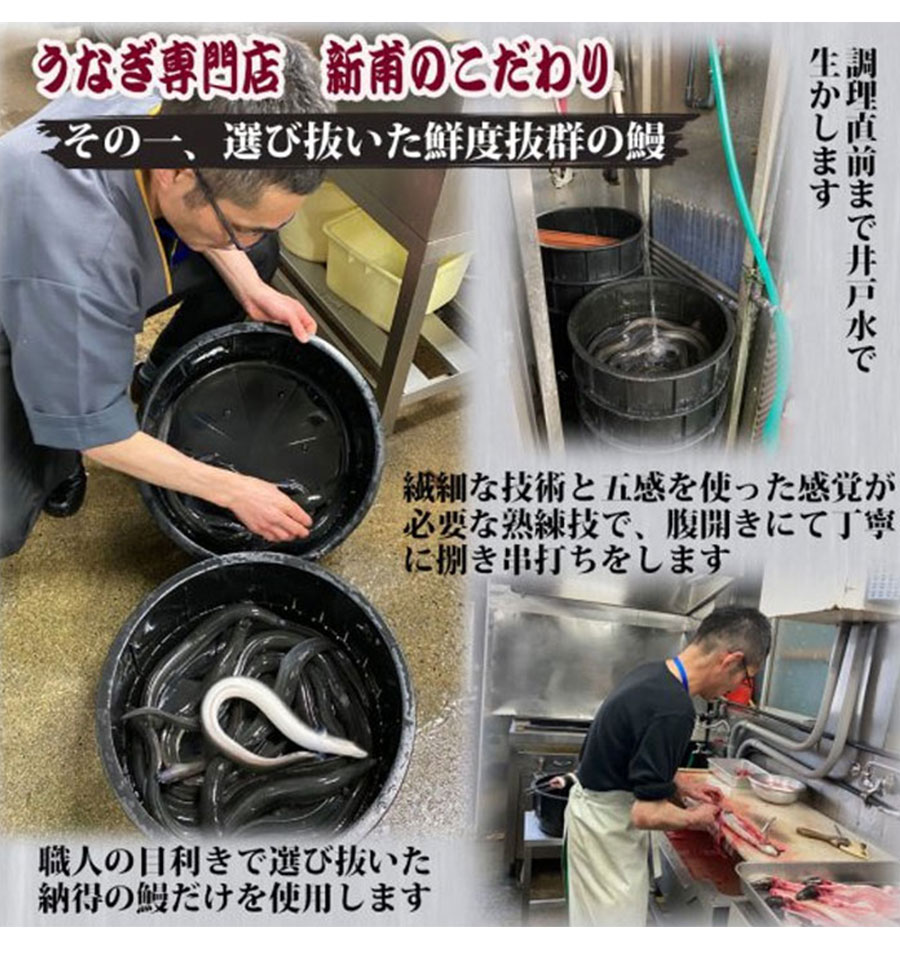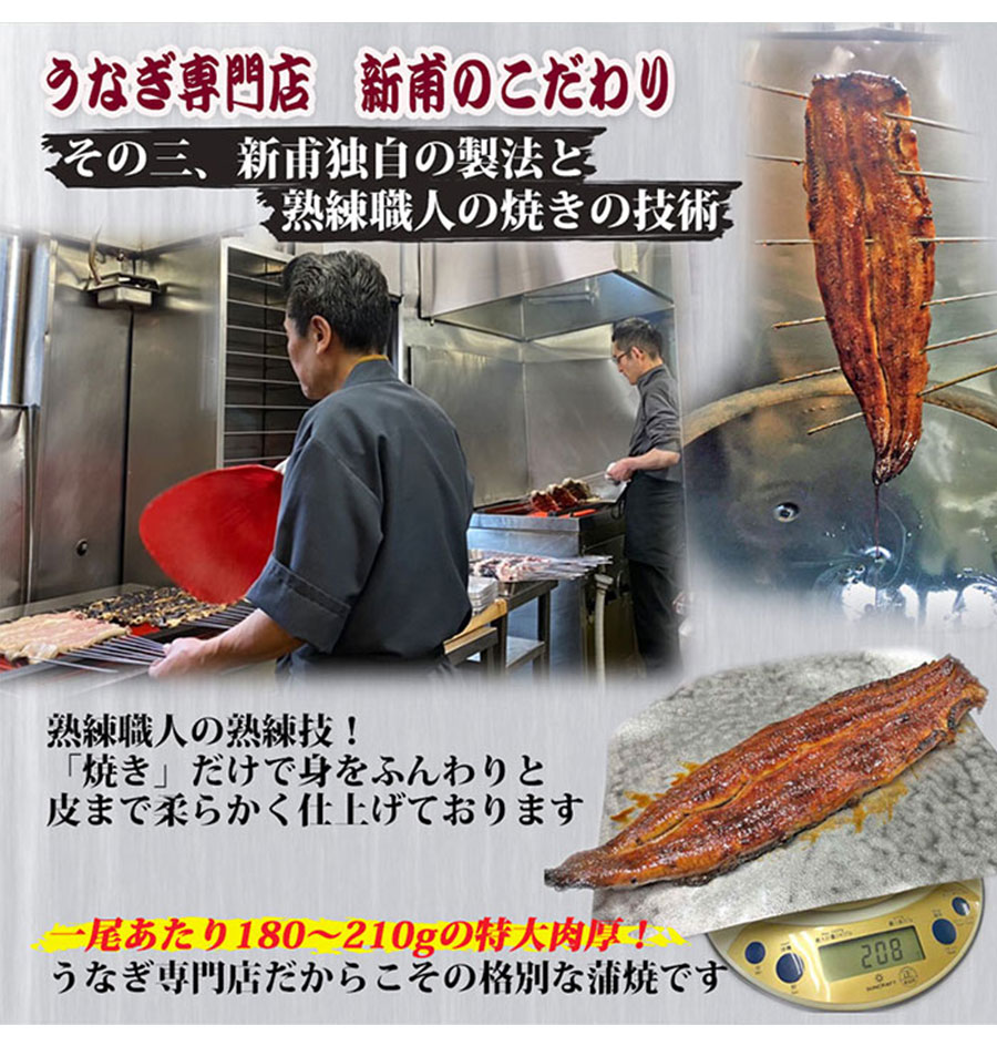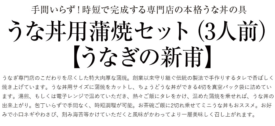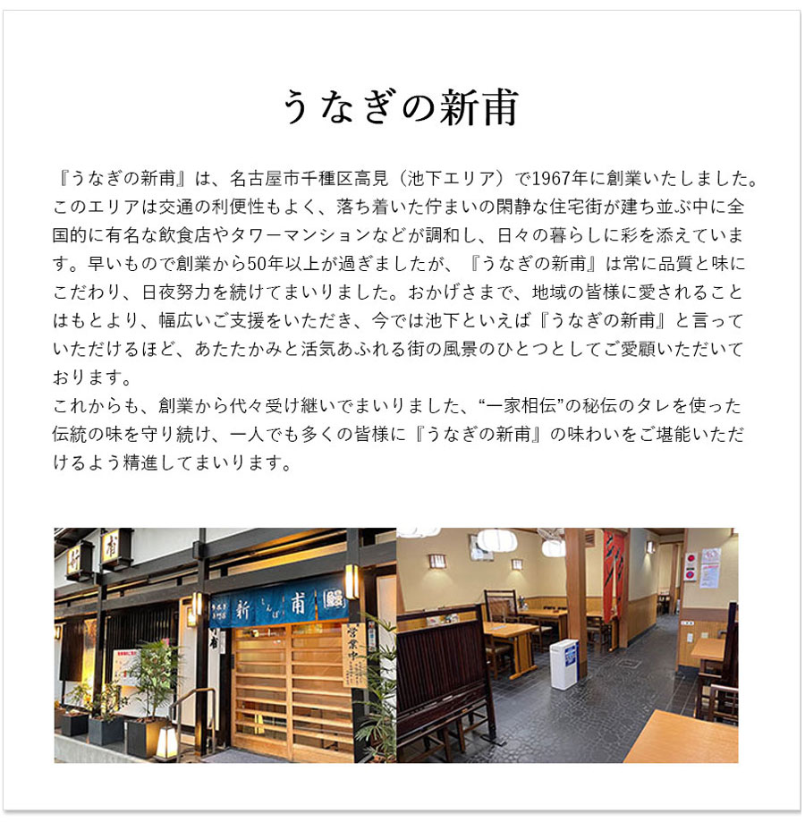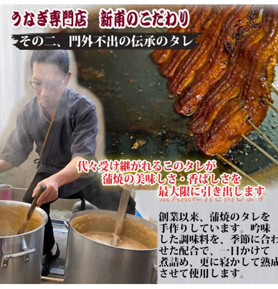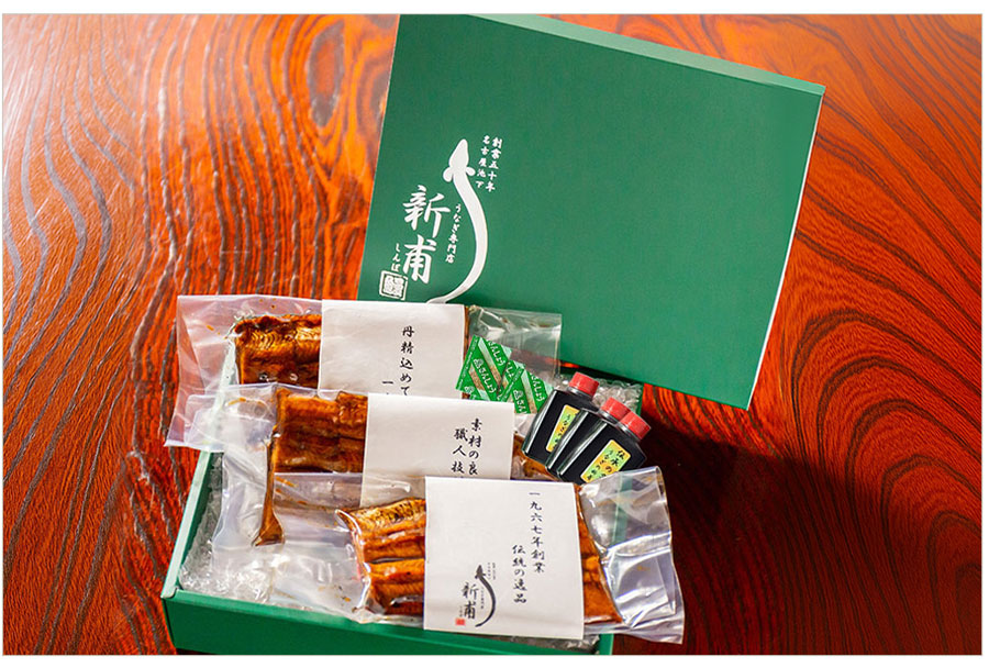 ○名称:水産加工品 ○内容量:鰻の蒲焼(4切・80g)×3袋、伝承のタレ・山椒各3 ○原材料名:【うなぎの蒲焼】ニホンウナギ(国産)、醤油、みりん、砂糖/調味料(アミノ酸等)、保存料(安息香酸Na)、ビタミンB1、(一部に大豆・小麦を含む) 【タレ】醤油、みりん、砂糖/調味料(アミノ酸等)、保存料(安息香酸Na)、ビタミンB1、(一部に大豆・小麦を含む) 【山椒】山椒 ○配送形態:冷凍 (宅配BOX・置配不可) ○保存方法:冷凍 ○賞味期限:出荷日より60日 ○熨斗:可 ○名入れ:可 ○包装:可 ○手提げ:不可 ○荷姿:化粧箱 ○備考:湯煎で約5分温めてください。もしくは真空パック袋に切れ目を入れて電子レンジで約1分温めて下さい。 ○販売者:【うなぎ専門店 うなぎの新甫】 〒464-0073 愛知県名古屋市千種区高見二丁目10-12 ○製造者:【有限会社新甫】 〒464-0073 愛知県名古屋市千種区高見二丁目10-12 <おすすめ用途> 自宅用 手土産 お歳暮 お年賀 お中元 敬老の日 ギフト プレゼント 贈り物 お礼 お返し ご挨拶 結婚祝 内祝い 誕生日 卒業 <贈る相手> 女性 男性 友人 家族 祖母 祖父 孫