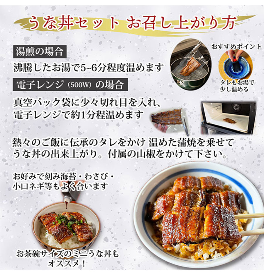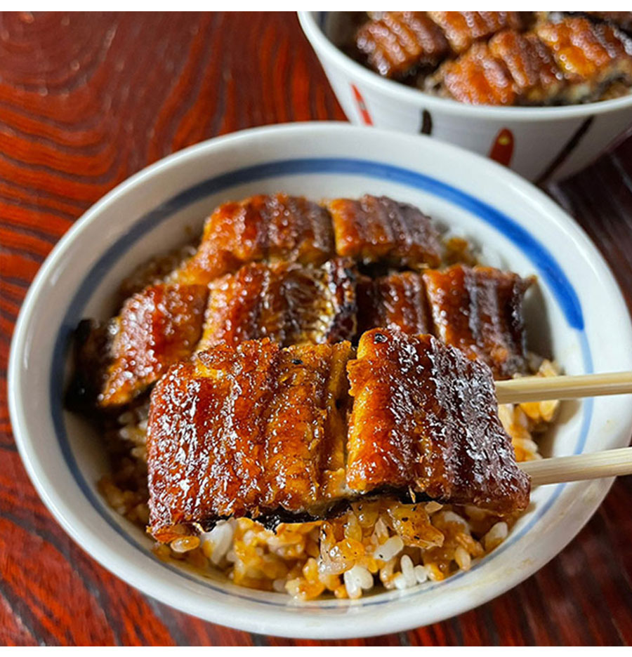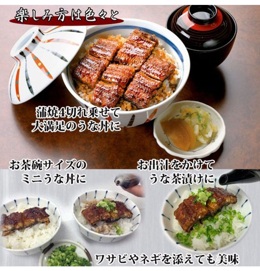 うなぎ専門店のこだわりを尽くした特大肉厚な蒲焼。創業以来守り継ぐ伝統の製法で手作りするタレで香ばしく焼き上げています。うな丼用サイズに蒲焼をカットし、ちょうどうな丼ができる4切を真空パック袋に詰めています。湯煎、もしくは電子レンジで温めていただき、熱々ご飯にタレをかけ、温めた蒲焼を乗せれば、うな丼の出来上がり。包丁いらずで手間なく、時短調理が可能。お茶碗ご飯に2切れ乗せてミニうな丼もおススメ。お好みで小口ネギやわさび、刻み海苔等かけていただくと風味がかわってより一層美味しく召し上がれます。