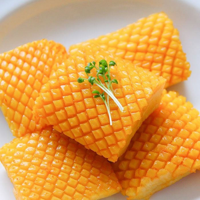 一口大にカットされたアカイカを縁起のいい黄金色に仕立てて焼成しました。スーパーヒーターで焼成していますので、お子様でも噛み切れるくらいふんわり柔らかな食感です。色味も綺麗でお祝い事などのお料理にもおススメです。