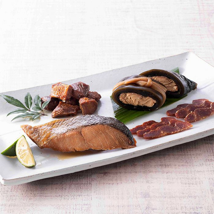新潟・村上市の先人が生み出した多数の鮭料理の中でも代表的な4品を詰合せました。 【鮭の焼漬 3切】白焼きした鮭の切身を醤油ベースの調味液に漬け込んで味つけした新潟県村上の伝統的な鮭の惣菜です。一度焼いた鮭と滲みた醤油だれの組合せが煮込み料理とは異なる風味と食感を生み出しています。昔は甕(かめ)など容器の中に漬け置きながら保存し、容器から取り出した後は加熱をせずそのまま食べていましたので、本来の食べ方にならい開封前後は加熱せず、そのままお召し上がりいただく事をお奨めいたします。 【鮭巻昆布 太巻1本】秋鮭のアラの部分ではなく秋鮭の身の部分を北海道産の昆布で巻いて煮込んだ「鮭の昆布巻」。味付けはシンプルに醤油と砂糖のみ。鮭・昆布の旨みと素朴な味付けがマッチした深い味わいです。「昆布巻」といえば全国的には「にしん」が一般的ですが、新潟県村上では「昆布巻」と言えば「鮭の昆布巻」です。 【鮭のうま煮 150g】秋鮭の角切りを醤油、砂糖などで煮込んだ惣菜です。見た目は素朴ですが、奥深い味わいです。 【鮭の酒びたし 30g】「鮭の酒びたし」は雄の秋鮭と塩のみを原料に、真冬の寒風から初夏の梅雨まで半年余りの時間をかけ干し上げた、独特の風味と旨味を醸した新潟県村上市の名産品です。「鮭の酒びたし」の名の由来は、薄切りを皿などに並べ、浸る程度の清酒をふりかけてから食べる事からで、「鮭の酒びたし」の読み方は「さけのさかびたし」と読みます。