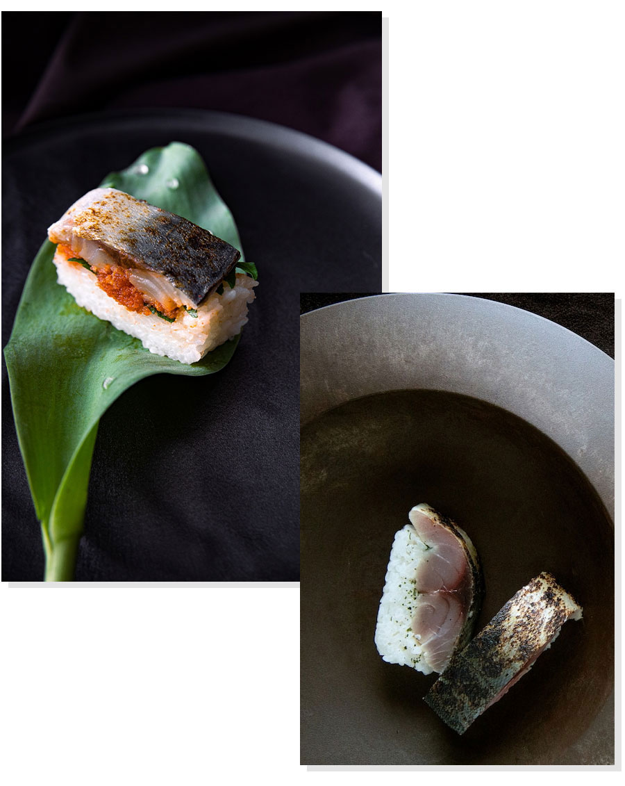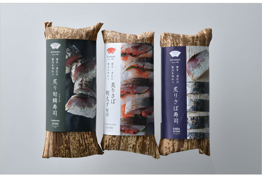 国産真サバの皮目を香ばしく炙り、濃厚な旨みを引き出した3種。定番の「炙りさば」、明太子の辛みに大葉の香りが粋な「明太子」。五島・対馬沖で獲れたブランド寒サバを用いた「旬鯖」は脂のりがたまらない。福岡の米と純米酢で仕上げたシャリとの相性も抜群!