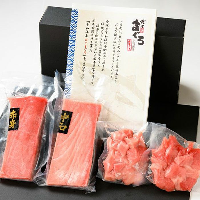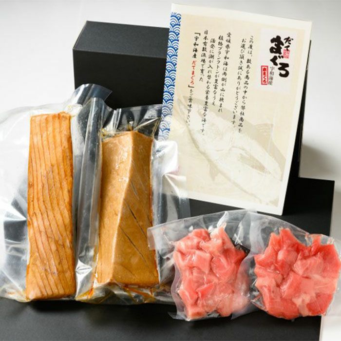他の画像を見る だてまぐろ詰合せ 宇和海の恵みを堪能するマグロの赤身・中トロ贅沢セット だてまぐろ詰合せ 販売価格 ¥ 10,800 税込 『だてまぐろ』は、「最高の養殖環境」と「職人のこだわり」 が創り上げた、宇和海産本まぐろのブランドです。まぐろ通にはもちろん、養殖本まぐろに馴染みのない方にこそおすすめです。 『だてまぐろ』は、初代・宇和島藩主の伊達秀宗に因んで付けられた名前です。「伊達」という言葉には、伊達家の生き様を象徴する「豪華」「魅力的」「粋」といった意味があり、そんな伊達の心意気を品質に込めたのが『だてまぐろ』です。 赤身は緻密な身質を誇り、雅やかな酸味ときめ細かな味わいに満ちています。中トロは、単に脂がのっているだけではなく、そこに上品さが伴いいつまでも味わっていたいほどの旨みが口いっぱいに広がります。赤身と中トロを取り交ぜた切落しは、食感の違いと口の中でとろけるようなコクをぜひお楽しみください。お刺身やお寿司はもちろん、脂がさらりとしているので、カルパッチョや卵黄をのっけたアボカドユッケもおすすめです。本品では、甘めの漬けだれで仕上げた柵と、まぐろ本来の旨みを感じられる切り落しの食べ比べをお楽しみいただけます。 養殖の常識を覆す旨みと脂のきめの細かさ、身質の美しさをご堪能ください。 詳細を見る お気に入りに登録する