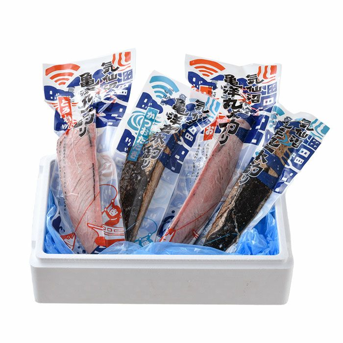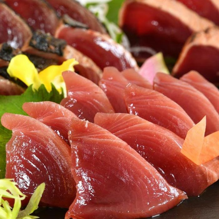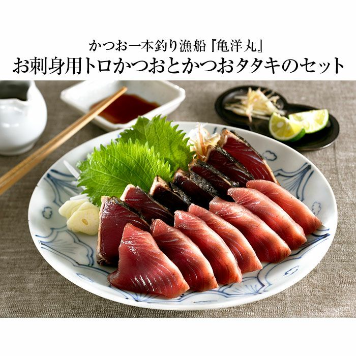 他の画像を見る かつお一本釣り漁船『亀洋丸』お刺身用トロかつおとかつおタタキのセット 一本釣りした旬のかつおのお刺身とタタキのセット かつお一本釣り漁船『亀洋丸』お刺身用トロかつおとかつおタタキのセット 販売価格 ¥ 5,400 税込 この身質とツヤをご覧あれ。遠洋漁船で一本釣りした旬の戻りカツオを生きたまま急速冷凍することで生に限りなく近い鮮度を誇る。「トロかつお」は、ねっとりとした舌触りでさわやかさもあり、「タタキ」は炙りの香りも旨みも品よし。良質な脂と職人仕事のなせる技にあっぱれ! 詳細を見る お気に入りに登録する