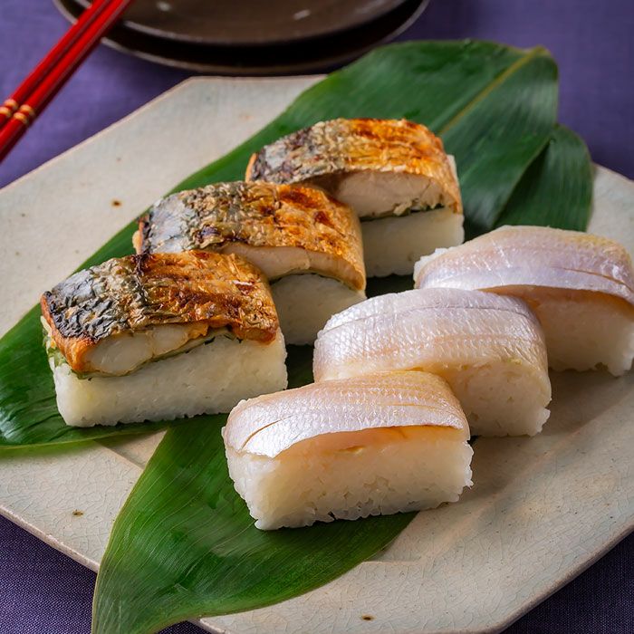 レンコ鯛の繊細な旨みを引き出した職人技の『小鯛ささ漬』と、肉厚で脂がのったサバを香ばしく仕上げた『焼きサバ』。若狭小浜の名産を押し寿司に。酢飯には福井県産のコシヒカリを使い、ネタとの間に潜ませたガリが後味を引き締める。貫禄のおいしさだ。
