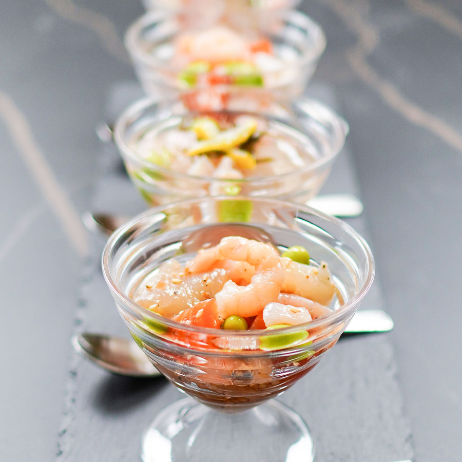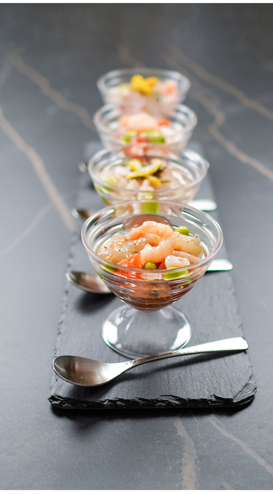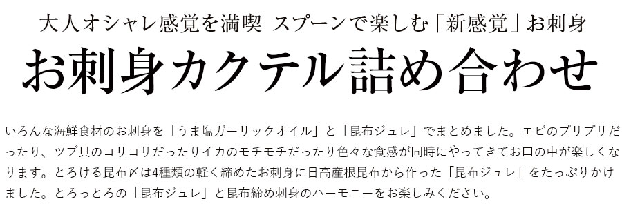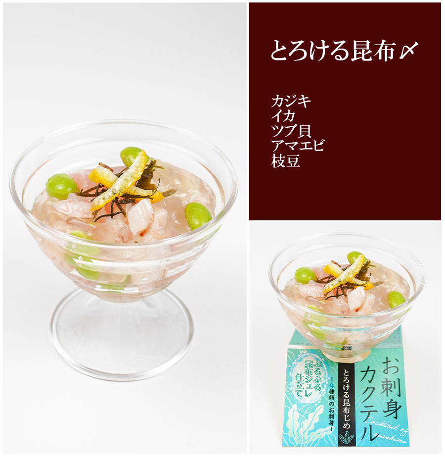 いろんな海鮮食材のお刺身を「うま塩ガーリックオイル」と「昆布ジュレ」でまとめました。エビのプリプリだったり、ツブ貝のコリコリだったりイカのモチモチだったり色々な食感が同時にやってきてお口の中が楽しくなります。とろける昆布〆は4種類の軽く締めたお刺身に日高産根昆布から作った「昆布ジュレ」をたっぷりかけました。とろっとろの「昆布ジュレ」と昆布締め刺身のハーモニーをお楽しみください。