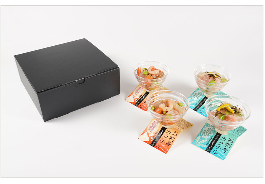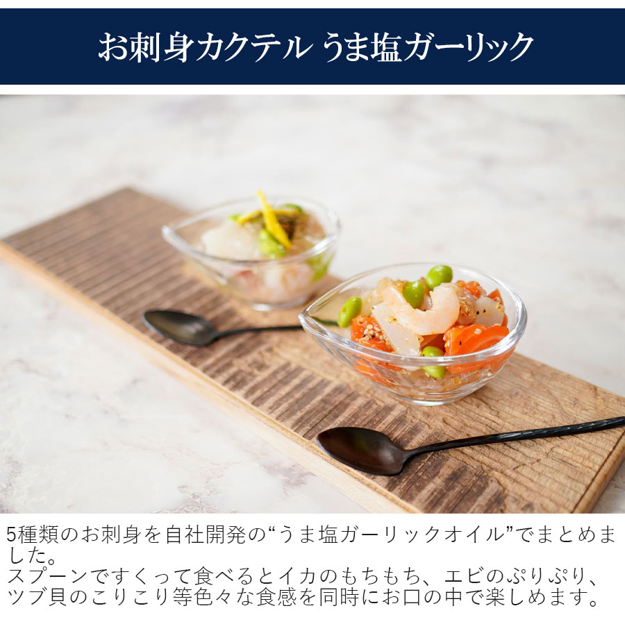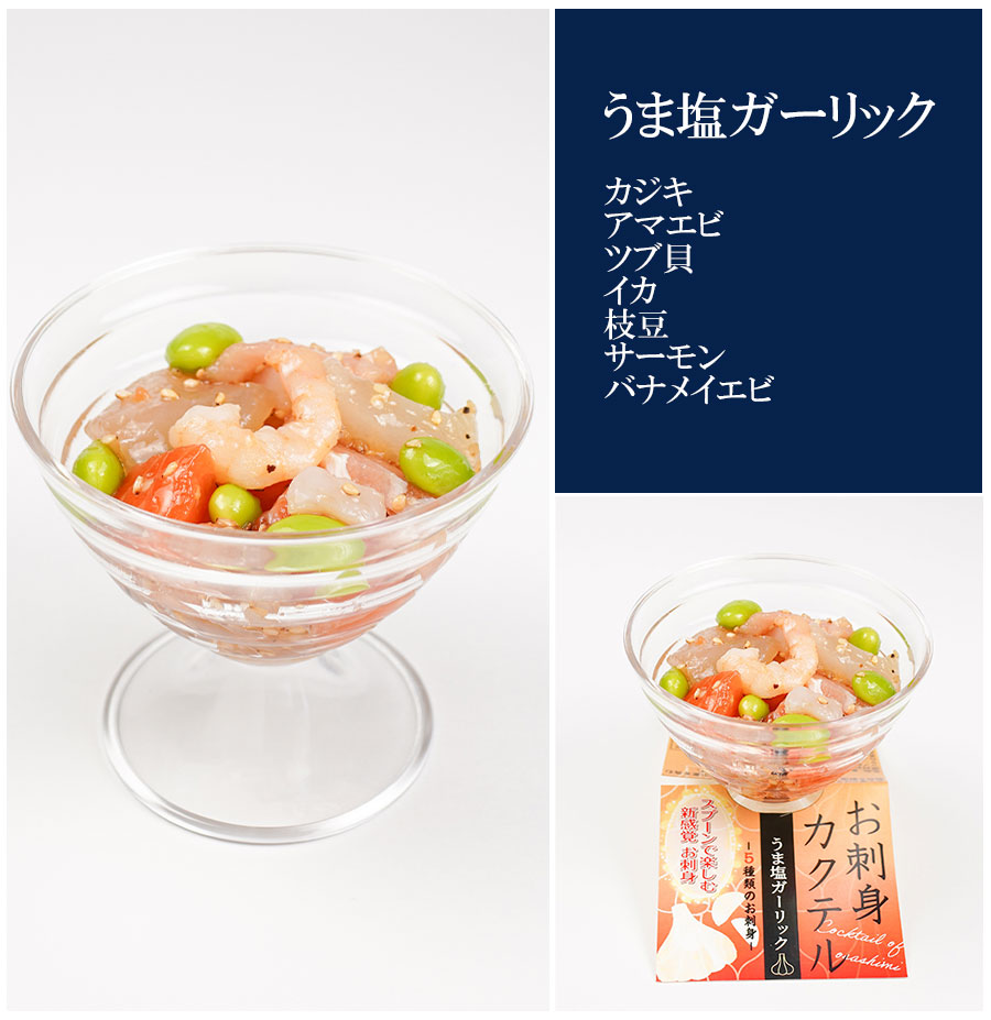 ○名称:味付け刺身 ○内容量:お刺身カクテルうま塩ガーリック(80g×2P)、お刺身カクテルとろける昆布〆(90g×2P) ○原材料名: 【うま塩ガーリック】カジキ、アマエビ、ツブ貝、イカ、枝豆(大豆を含む)、サーモン、バナメイエビ、ごま油、白ゴマ、ニンニク、食塩、しょうゆ(小麦・大豆を含む)、辣油、胡椒 / 調味料(アミノ酸) 【とろける昆布〆】カジキ、イカ、ツブ貝、アマエビ、枝豆(大豆を含む)、昆布エキス、食塩、かつお節エキス、昆布、柚子 / ゲル化剤(増粘多糖類)、調味料(アミノ酸) ○配送形態:冷凍(宅配BOX・置配不可) ○保存方法:冷凍 ○賞味期限:冷凍90日 ○熨斗:不可 〇名入れ:不可 ○包装:不可 〇手提げ:不可 ○備考:解凍してスプーンですくってお召し上がりください。 ○製造者:【株式会社葵食品】〒933-0816富山県高岡市二塚199-13