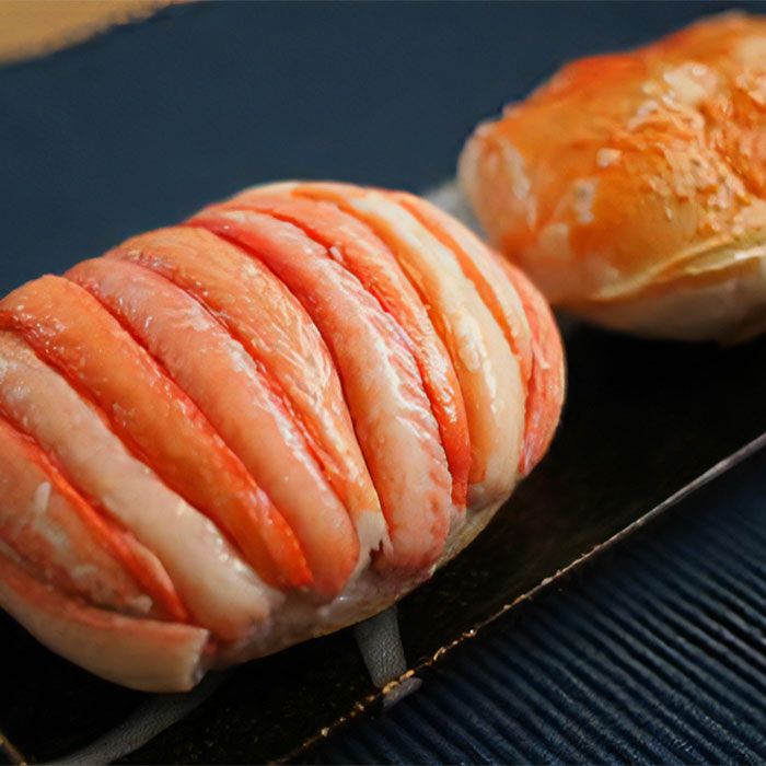 かにの甲らにかまぼこの身をつめ、表面に本物の紅ズワイガニを隙間なく贅沢にはったかまぼこです。なめらかなかまぼこ生地ですので、一口食べるとかにのうま味と素材感を存分に堪能できます。