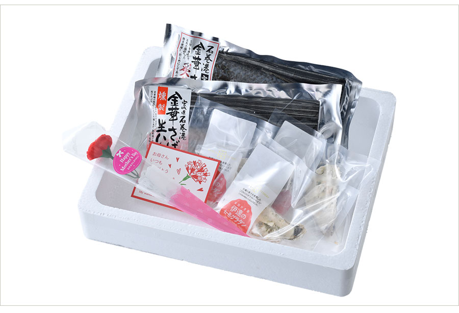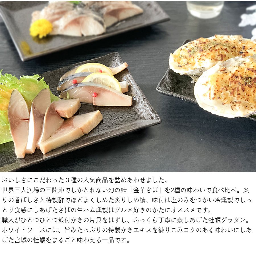 ○名称:さば、かき加工品 ○内容量:宮城県産金華さば炙りしめ鯖(大)1枚入×1パック、宮城県産金華さば生ハム燻製(大)1枚入×1パック、宮城県産伊達の牡蠣グラタン(中)1個入×3パック ○原材料名: 【宮城県産金華さば炙りしめ鯖(大)】真さば(宮城県産)、食塩、醸造酢、発酵調味料、砂糖、昆布だし 【宮城県産金華さば生ハム燻製(大)】真さば(宮城県産)、食塩 【宮城県産伊達の牡蠣グラタン(中)1個入】かき(宮城県産)、かき煮汁、牛乳、ホワイトソースの素(デキストリン、小麦粉、チーズパウダー、食用加工油脂、オニオンパウダー、全粉乳、食塩、砂糖、酵母エキス、こしょう、たん白加水分解物、バターオイル、食用なたね油)、ナチュラルチーズ、バター、小麦粉、乳等を主要原料とする食品、パン粉、パセリ、砂糖、食塩、こしょう/調味料(アミノ酸等)、乳化剤、香料、pH調整剤、(一部に乳成分・小麦・大豆を含む) ○配送形態:冷凍 (宅配BOX・置配不可) ○保存方法:冷凍 ○賞味期限:出荷日より冷凍90日 ○熨斗:可 ○名入れ:不可 ○包装:不可 ○手提げ:不可 ○荷姿:発泡箱 ○備考:本品は冷凍品ですが解凍後はお早めに召し上がり下さい。母の日の造花(カーネーション)は通常お届けにも付属します。 ○製造者:【本田水産株式会社】 宮城県石巻市流留字五性橋9-45 <おすすめ用途> 自宅用 手土産 お年賀 母の日 父の日 お中元 敬老の日 お歳暮 バレンタイン ホワイトデー ギフト プレゼント 贈り物 贈答 お礼 お返し ご挨拶 結婚祝 出産祝 内祝い 誕生日 入学 卒業 <贈る相手> 女性 男性 友人 家族 祖母 祖父 孫