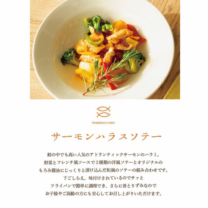 他の画像を見る サーモンハラスソテー3種セット 簡単調理!骨なし鮭ハラスの洋風&和風ソテーが楽しめるセット サーモンハラスソテー3種セット 販売価格 ¥ 5,640 税込 鮭の中でも高い人気のアトランティックサーモンのハラス。野菜とフレンチ風ソースで2種類の洋風ソテーとオリジナルのもろみ醤油にじっくりと漬け込んだ和風のソテーの組み合わせです。下ごしらえ、味付けされているのでサッとフライパンで簡単に調理でき、さらに骨とりずみなのでお子様やご高齢の方にも安心してお召し上がりいただけます。 詳細を見る お気に入りに登録する