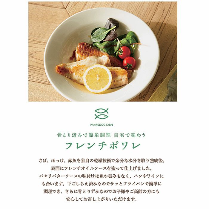 他の画像を見る フレンチポワレ3種セット(サバ・ほっけ・赤魚) フレンチ風味で仕上げた、魚3種の香ばしい洋風ごちそう惣菜 フレンチポワレ3種セット(サバ・ほっけ・赤魚) 販売価格 ¥ 4,950 税込 さば、ほっけ、赤魚を独自の乾燥技術で余分な水分を取り、熟成後、表面にフレンチオイルソースを塗って仕上げました。パセリバターソースの味付けは魚の臭みもなく、パンやワインにも合います。下ごしらえ済みなのでサッとフライパンで簡単に調理でき、さらに骨とりずみなのでお子様やご高齢の方にも安心してお召し上がりいただけます。 詳細を見る お気に入りに登録する