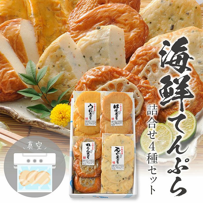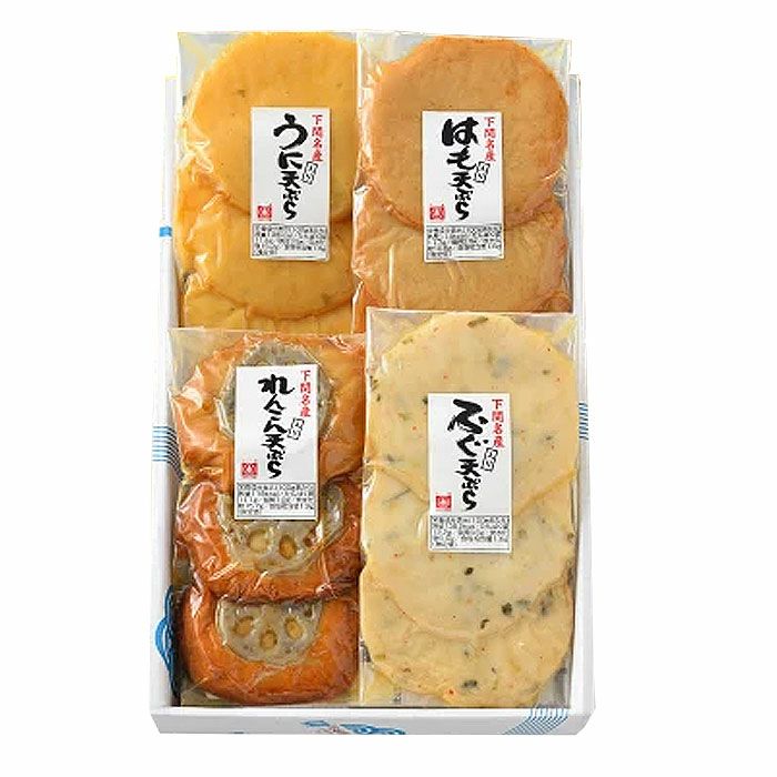他の画像を見る 下関・唐戸の市 天ぷら4種詰合せ(真空) 下関名物の天ぷら4種、真空パックで美味しさ長持ち 下関・唐戸の市 天ぷら4種詰合せ(真空) 販売価格 ¥ 3,850 税込 下関・唐戸市場から届く、贅沢な天ぷらの饗宴。ふっくらとした「ふぐ入天ぷら」は口の中でほろりとほどけ、濃厚な「うに入天ぷら」は旨みがじゅわっと広がります。じんわり懐かしい風味の「れんこん入天ぷら」は噛むほどに旨味が増し、ふわりと軽い「はも入天ぷら」は上品な味わいが特徴。すべて真空パックで美味しさ長持ち、手軽に本格の味を楽しめます。贅沢な晩酌のお供やおもてなしにもぴったりな4種詰合せを存分に楽しめます。 詳細を見る お気に入りに登録する