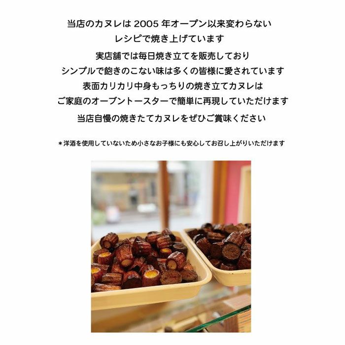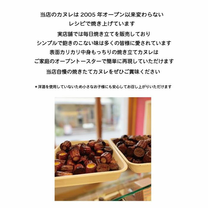 他の画像を見る カヌレミックスギフトボックスL プレーン&チョコレートのカヌレ詰合せ、贈り物に最適 カヌレミックスギフトボックスL 販売価格 ¥ 4,520 税込 当店自慢のカヌレをたっぷり楽しめるギフトボックスです。フランス・ボルドー地方発祥の伝統的な焼き菓子カヌレは、中はしっとりもちもちの独特な食感が特徴です。プレーンは厳選した国産牛乳とバター、卵を使い、素材の豊かな風味が広がります。チョコレートカヌレにはココアパウダーを加え、深みのあるコクとほろ苦さがアクセント。季節ごとに変わるシーズンカヌレも楽しみのひとつで、贈り物や自分へのご褒美にぴったりの逸品です。 詳細を見る お気に入りに登録する