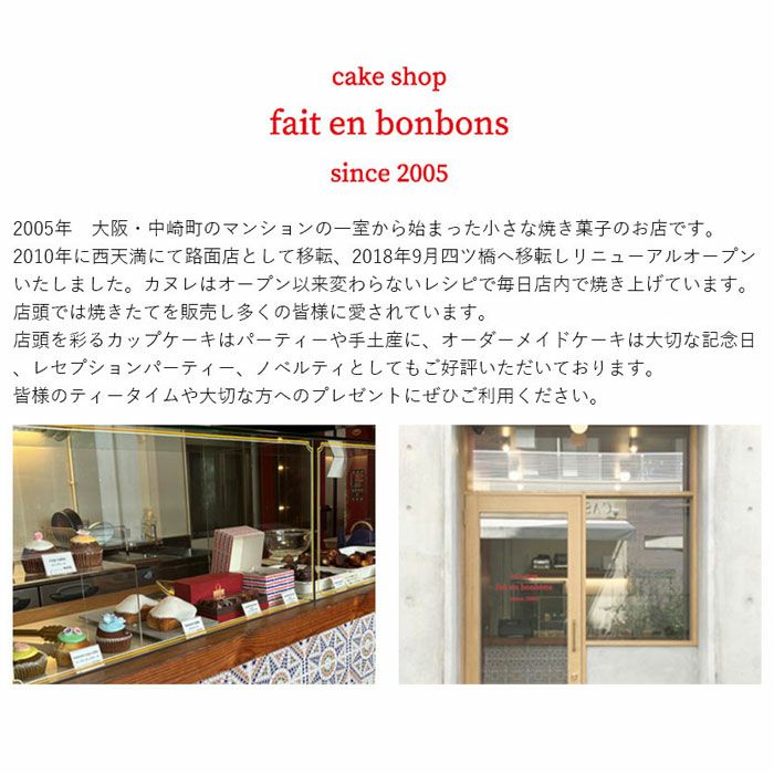他の画像を見る カヌレ&レモンケーキボックス 人気のカヌレと甘酸っぱいレモンケーキの贅沢洋菓子セット カヌレ&レモンケーキボックス 販売価格 ¥ 4,140 税込 当店自慢のカヌレとレモンケーキを詰め合わせたギフトボックスです。カヌレはフランス伝統の焼き菓子で、中はしっとりもっちりとした食感が特徴。厳選した牛乳とバター、たっぷりの卵を使い、素材本来の風味を活かしました。レモンケーキは爽やかな国産レモン果汁と香ばしいアーモンドプードルを加え、しっとりとした口当たりと程よい酸味が広がります。どちらも手作りにこだわり、フェッタンボンボンのオリジナルボックスに詰め合わせてお届け致します。贈り物や特別な日のティータイムにぴったりの一品です。 詳細を見る お気に入りに登録する