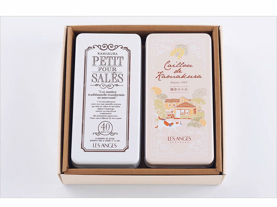 鎌倉レ・ザンジュの人気焼き菓子2缶セット。 フランスの伝統的な「ゲランド塩」を使って、わずかな砂糖で丁寧に焼き上げたレ・ザンジュで一番人気のオリジナル塩味クッキー缶「プティフールサレ」と、歴史と自然、そして鎌倉ならではのゆったりとした空気感を詰め込んだ特別なクッキー缶「鎌倉の小石」の詰合せです。