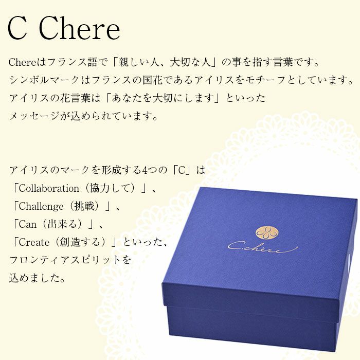 他の画像を見る C Chere(シー・シェール) ガトーショコラ スリム(2本入り) 鹿児島産のサトウキビからとった優しい甘さ C Chere(シー・シェール) ガトーショコラ スリム(2本入り) 販売価格 ¥ 5,180 税込 「C Chere」のオリジナル商品です。ほのかな酸味と甘さのバランスが取れた、カカオ成分56%の濃厚なチョコレートをふんだんに使用し、鹿児島産のサトウキビからとった優しい甘さが特徴です。Chereはフランス語で「親しい人、大切な人」の事を指す言葉です。シンボルマークはフランスの国花であるアイリスをモチーフとしています。アイリスの花言葉は「あなたを大切にします」といったメッセージが込められています。アイリスのマークを形成する4つの「C」は「Collaboration(協力して)」、「Challenge(挑戦)」、「Can(出来る)」、「Create(創造する)」といった、フロンティアスピリットを込めました。 詳細を見る お気に入りに登録する