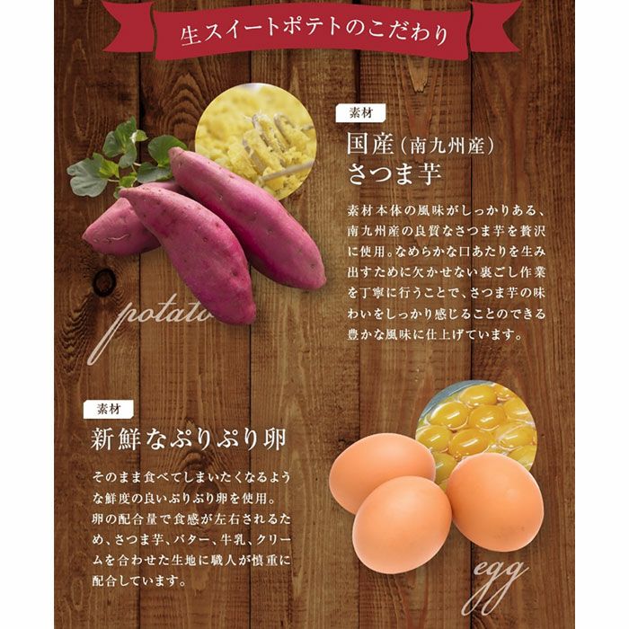 他の画像を見る 生スイートポテト(6本入り) さつま芋×プリンの新感覚ハイブリッドスイーツ 生スイートポテト(6本入り) 販売価格 ¥ 4,880 税込 冷やしてスプーンで食すスイートポテトというのが新鮮。南九州産の良質なサツマイモを使い、丁寧な裏ごし作業と南蛮窯での蒸し焼きで、他にはないとろ~りなめらかな舌触りを実現した。添加物に頼らず、芋本来の自然な甘みと風味がじんわり広がって、なんとも口福。 詳細を見る お気に入りに登録する