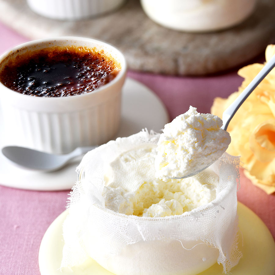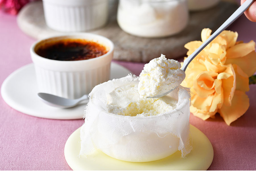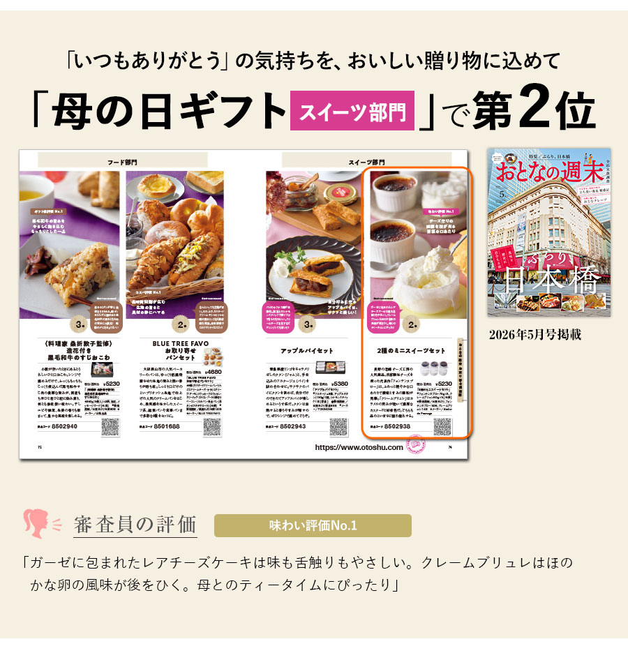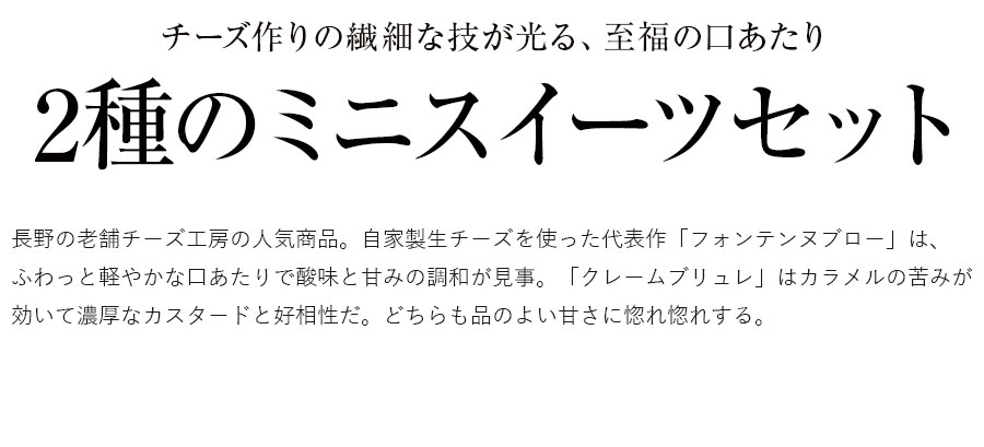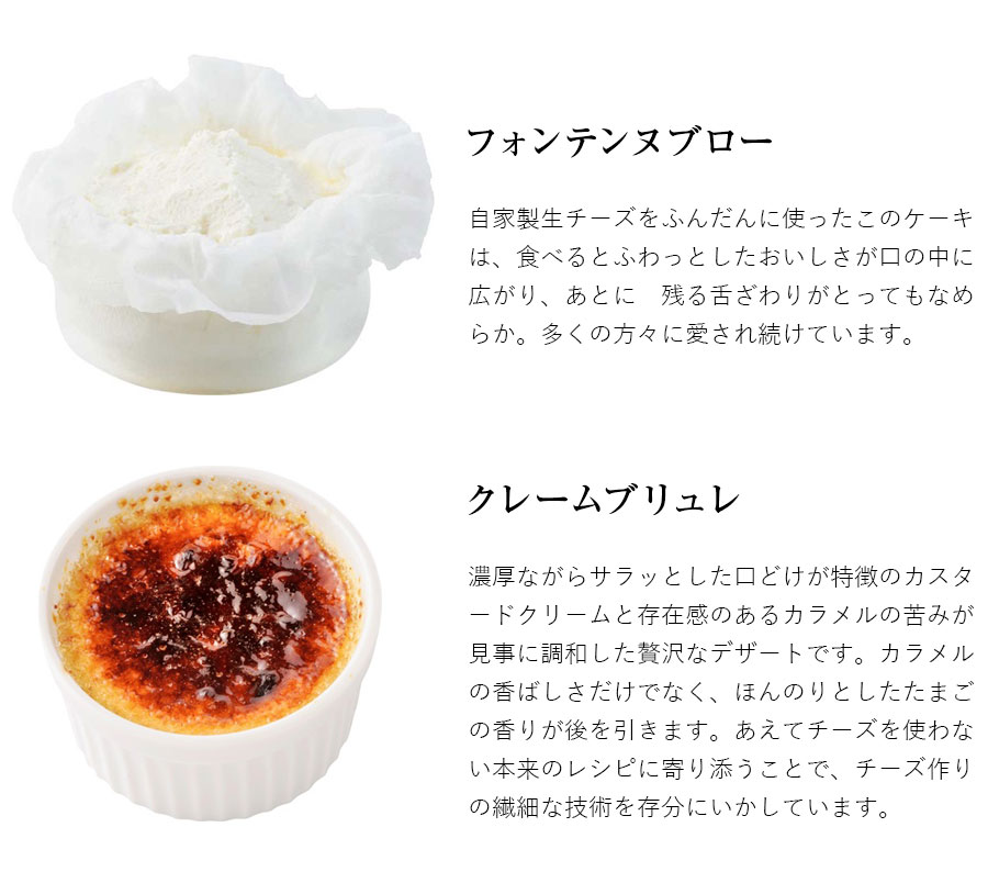 長野の老舗チーズ工房の人気商品。自家製生チーズを使った代表作「フォンテンヌブロー」は、ふわっと軽やかな口あたりで酸味と甘みの調和が見事。「クレームブリュレ」はカラメルの苦みが効いて濃厚なカスタードと好相性だ。どちらも品のよい甘さに惚れ惚れする。