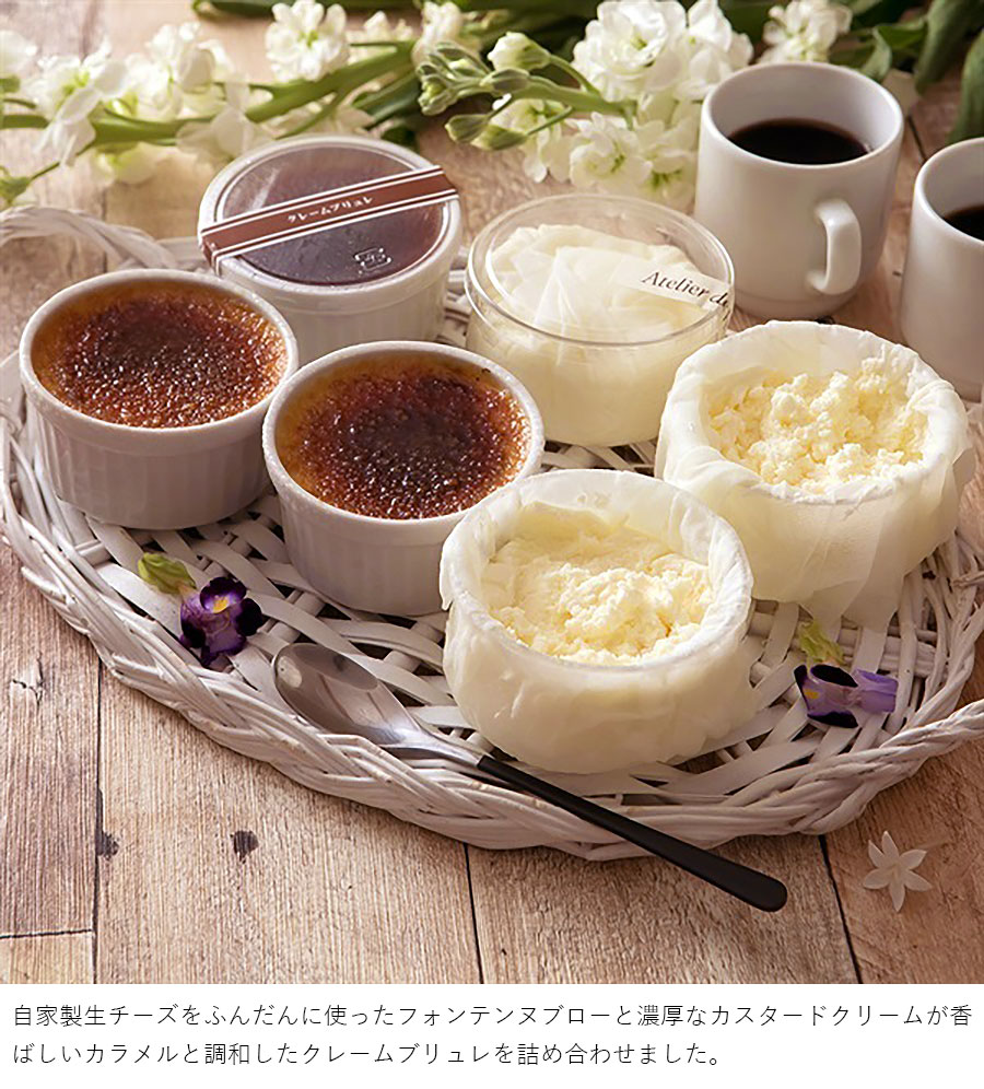 ○名称:洋生菓子 ○内容量:フォンテンヌブロー75g×3、クレームブリュレ50g×3 ○原材料名: 【フォンテンヌブロー】クリーム(国内製造)、ナチュラルチーズ、砂糖 【クレームブリュレ】クリーム(国内製造)、牛乳、砂糖、卵黄、バニラシーズペースト/香料 ○配送形態:冷凍 (宅配BOX・置配不可) ○保存方法:冷凍 ○賞味期限:出荷日より、フォンテンヌブロー30日、クレームブリュレ14日 ○熨斗:可 ○名入れ:可 ○包装:可 ○手提げ:可(紙袋) ○荷姿:化粧箱 ○備考: ○販売者:【アトリエ・ド・フロマージュ】 〒389-0501 長野県東御市新張504-6 ○製造者:【株式会社アトリエ・ド・フロマージュ】 〒389-0501 長野県東御市新張504-6 <おすすめ用途> 自宅用 手土産 お年賀 母の日 父の日 お中元 敬老の日 お歳暮 バレンタイン ホワイトデー ギフト プレゼント 贈り物 贈答 お礼 お返し ご挨拶 結婚祝 出産祝 内祝い 誕生日 入学 卒業 <贈る相手> 女性 男性 友人 家族 祖母 祖父 孫