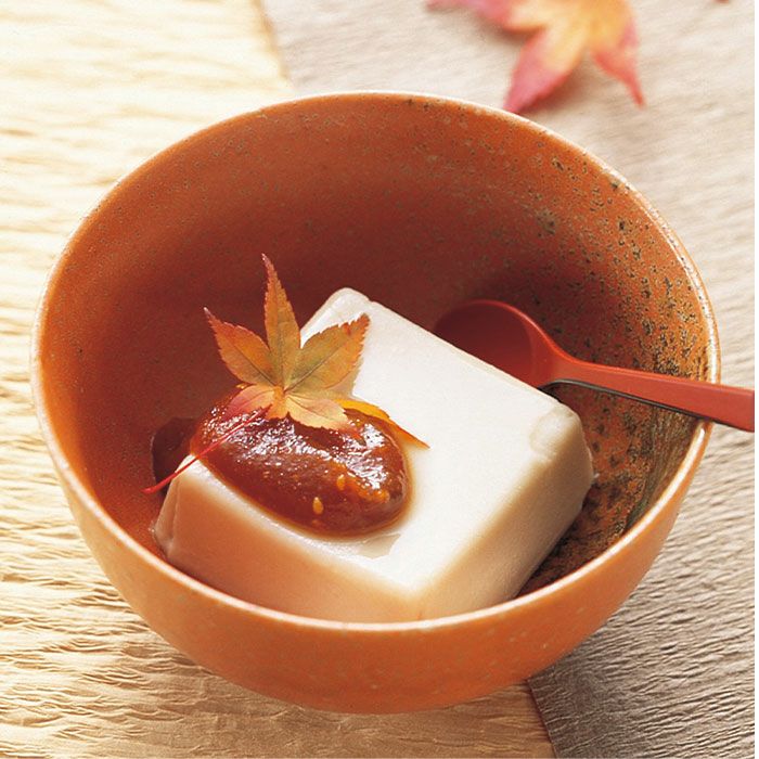 口に運ぶとふっと香る芳ばしいごまの風味と、とてもなめらかでもっちりとした食感が人気です。吉野葛をたくさん使用しているため、もっちり感があり、独特な食感のごまどうふです。口当たりもなめらかで、わさび醤油や付属の「なめみそ」をつけて食べるとより美味しく召し上がれます。