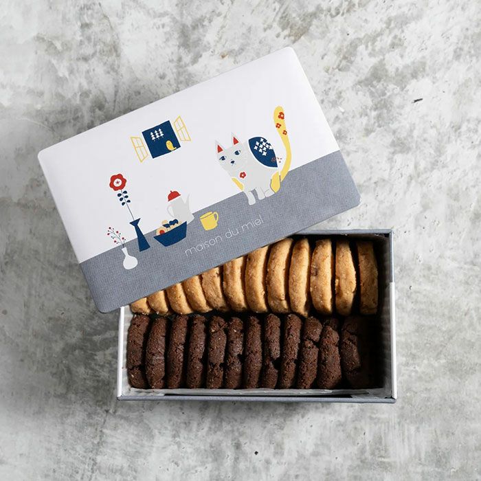 ダイニングでお菓子を狙う猫の表情もどこか愛しく思えてくる猫缶。子どもの頃、とってもワクワクしたクッキー缶に猫のかわいいデザインをプラスしました。毎日少しずつ食べて、食べ終わったら缶の中に宝物を入れて…そんな思い出のあるクッキー缶をメゾンデュミエルがオシャレに仕上げました。食べ終わった後も大切にとっておきたくなるギフトでありますように、というあたたかい想いを込めて丁寧に作られています。