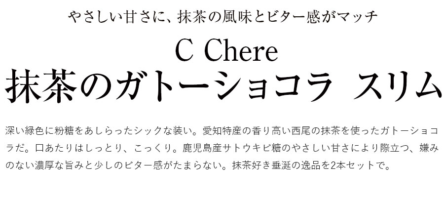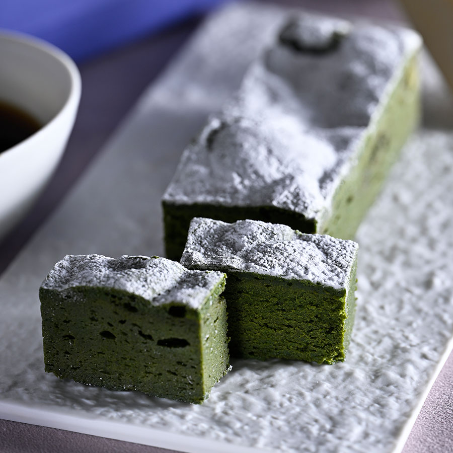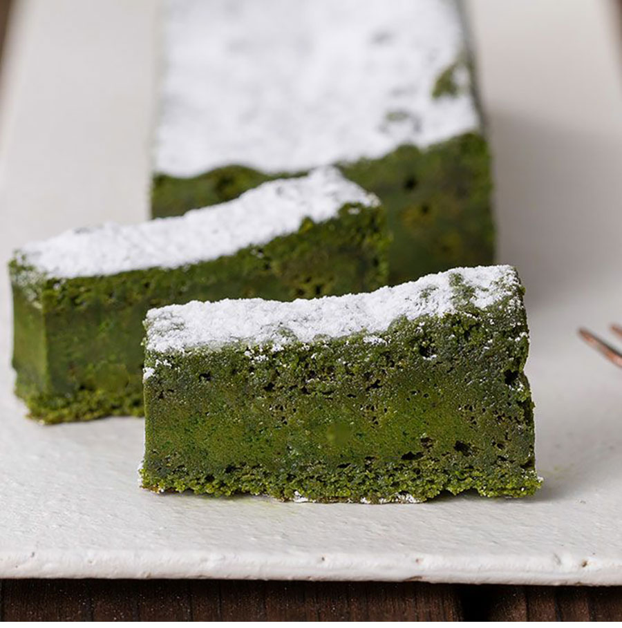 深い緑色に粉糖をあしらったシックな装い。愛知特産の香り高い西尾の抹茶を使ったガトーショコラだ。口あたりはしっとり、こっくり。鹿児島産サトウキビ糖のやさしい甘さにより際立つ、嫌みのない濃厚な旨みと少しのビター感がたまらない。抹茶好き垂涎の逸品を2本セットで。