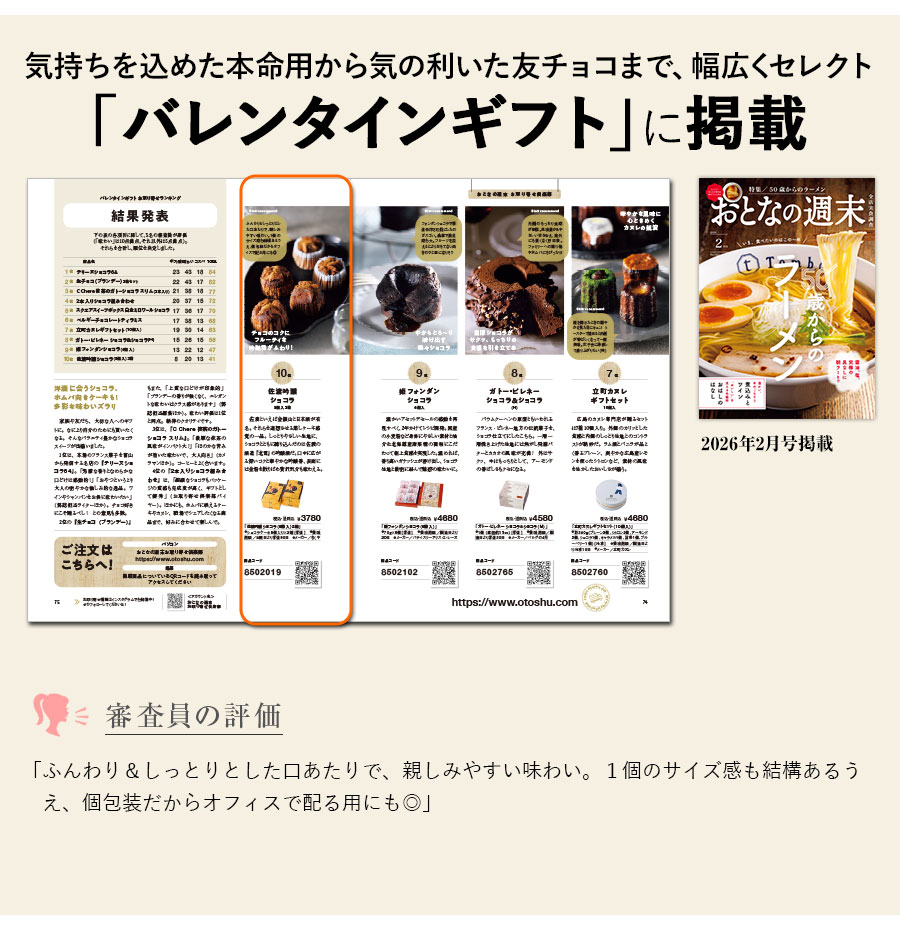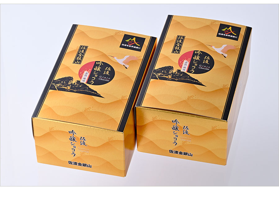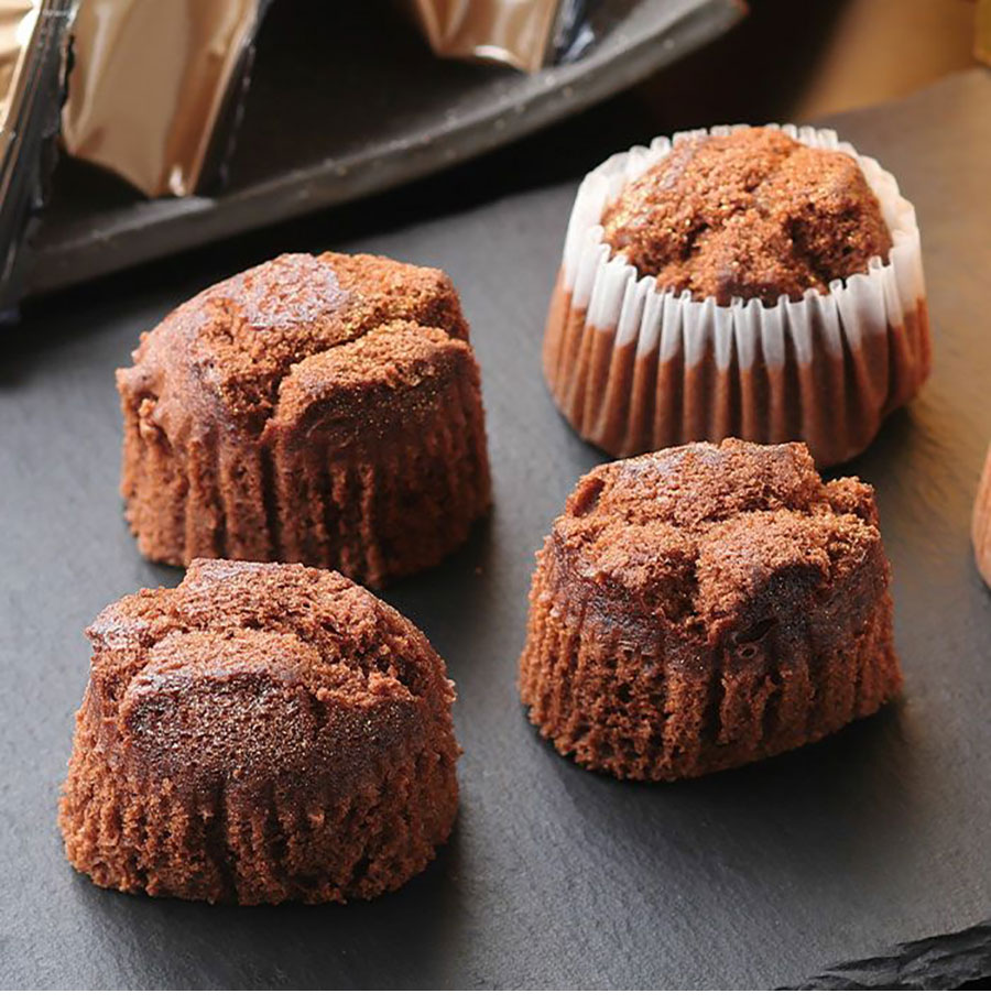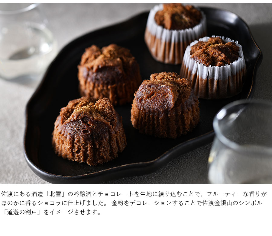 佐渡といえば金銀山と日本酒が有名。それらを連想させる蒸しケーキ感覚の一品。しっとりやさしい生地に、ショコラとともに練り込んだのは佐渡の酒造『北雪』の吟醸酒だ。口中に広がる深いコクと華やかな吟醸香、表面には金粉を散りばめ贅沢気分も味わえる。