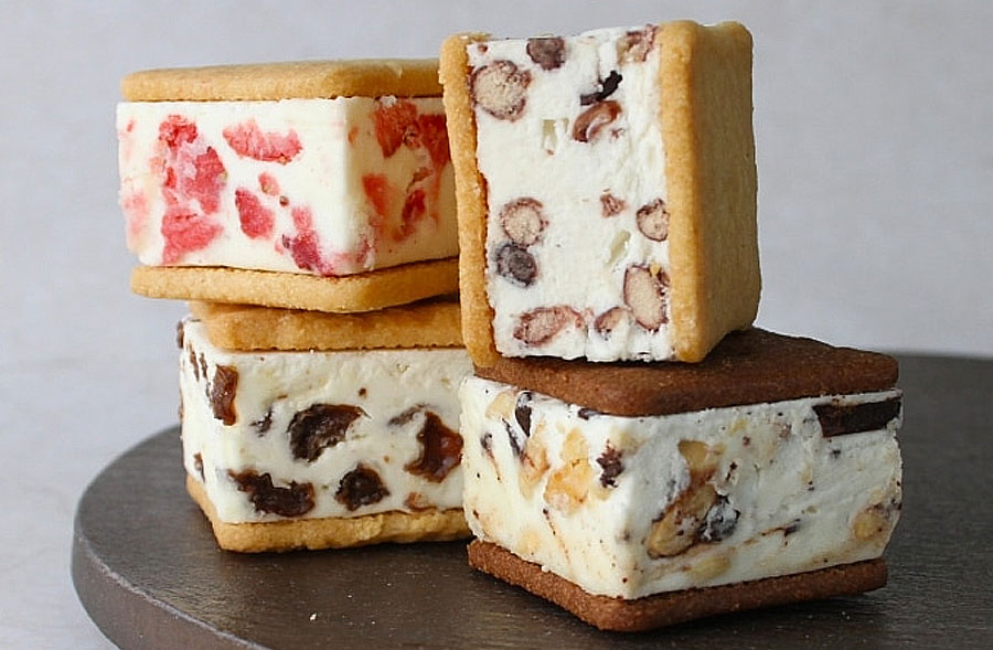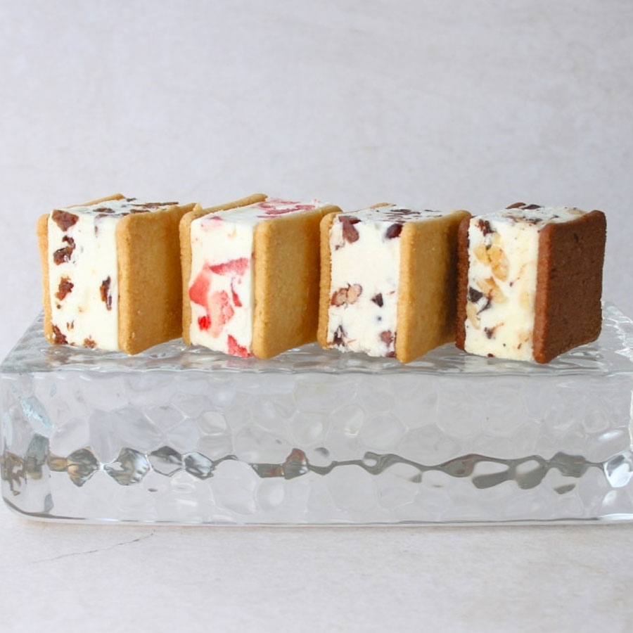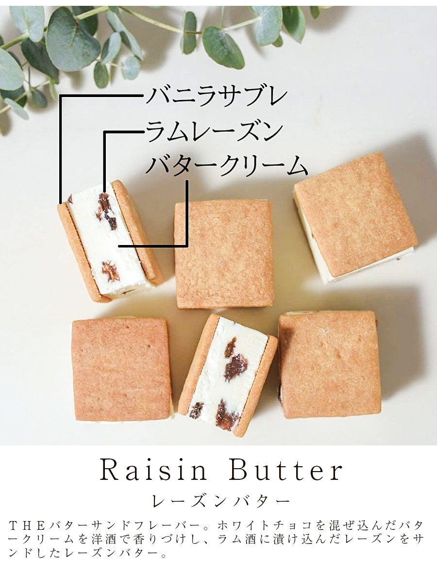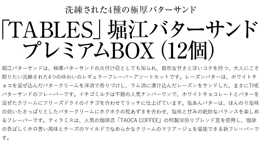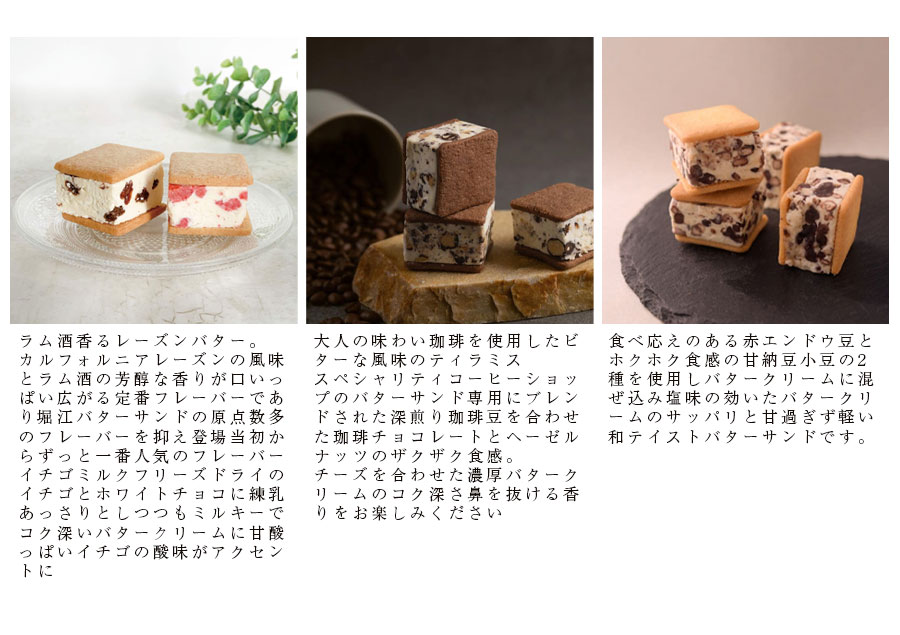 堀江バターサンドは、極厚バターサンドの火付け役としても知られ、自然な甘さと深いコクを持つ、大人にこそ贈りたい洗練された4つの味わいのレギュラーフレーバーアソートセットです。レーズンバターは、ホワイトチョコを混ぜ込んだバタークリームを洋酒で香りづけし、ラム酒に漬け込んだレーズンをサンドした、まさにTHEバターサンドのフレーバーです。イチゴミルクは不動の人気ナンバーワンで、ホワイトチョコレートとバターを混ぜたクリームにフリーズドライのイチゴを合わせてリッチに仕上げています。塩あんバターは、ほんのり塩味の効いたさっぱりとしたバタークリームにホクホクの粒あずきを合わせ、塩味と甘みの絶妙なバランスを楽しめるフレーバーです。ティラミスは、人気の珈琲店「TAOCA COFFEE」の特製深煎りブレンド豆を使用し、珈琲の香ばしくホロ苦い風味とチーズのマイルドでなめらかなクリームのマリアージュを堪能できる新フレーバーです。