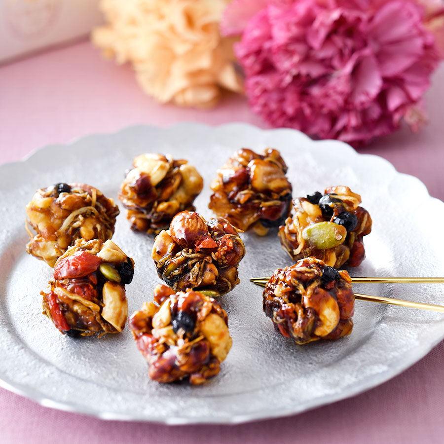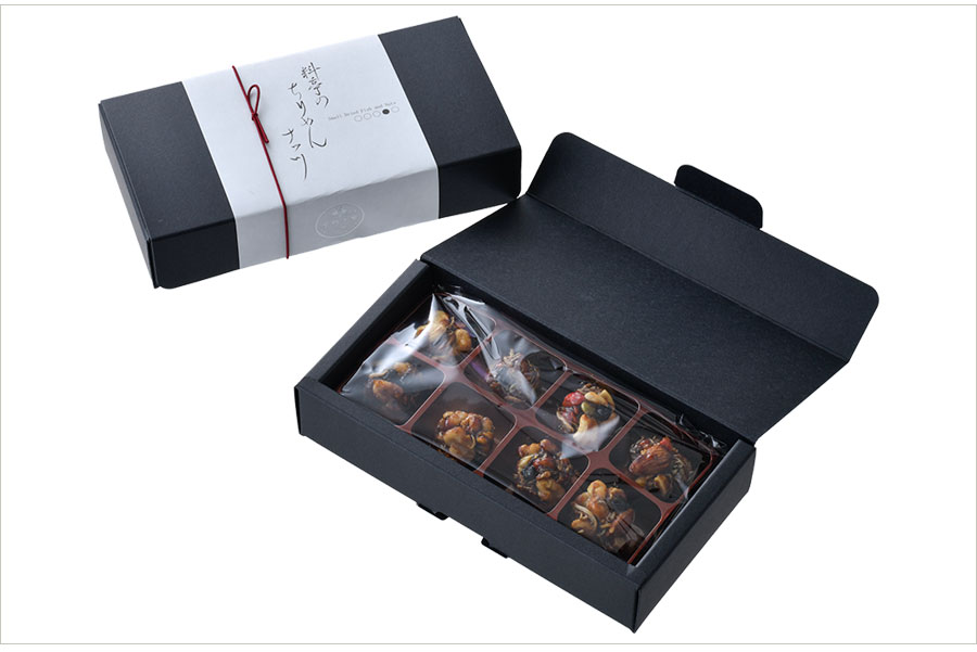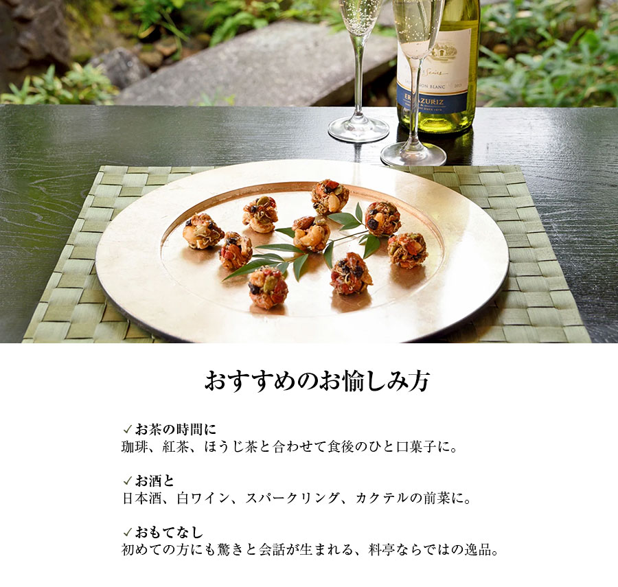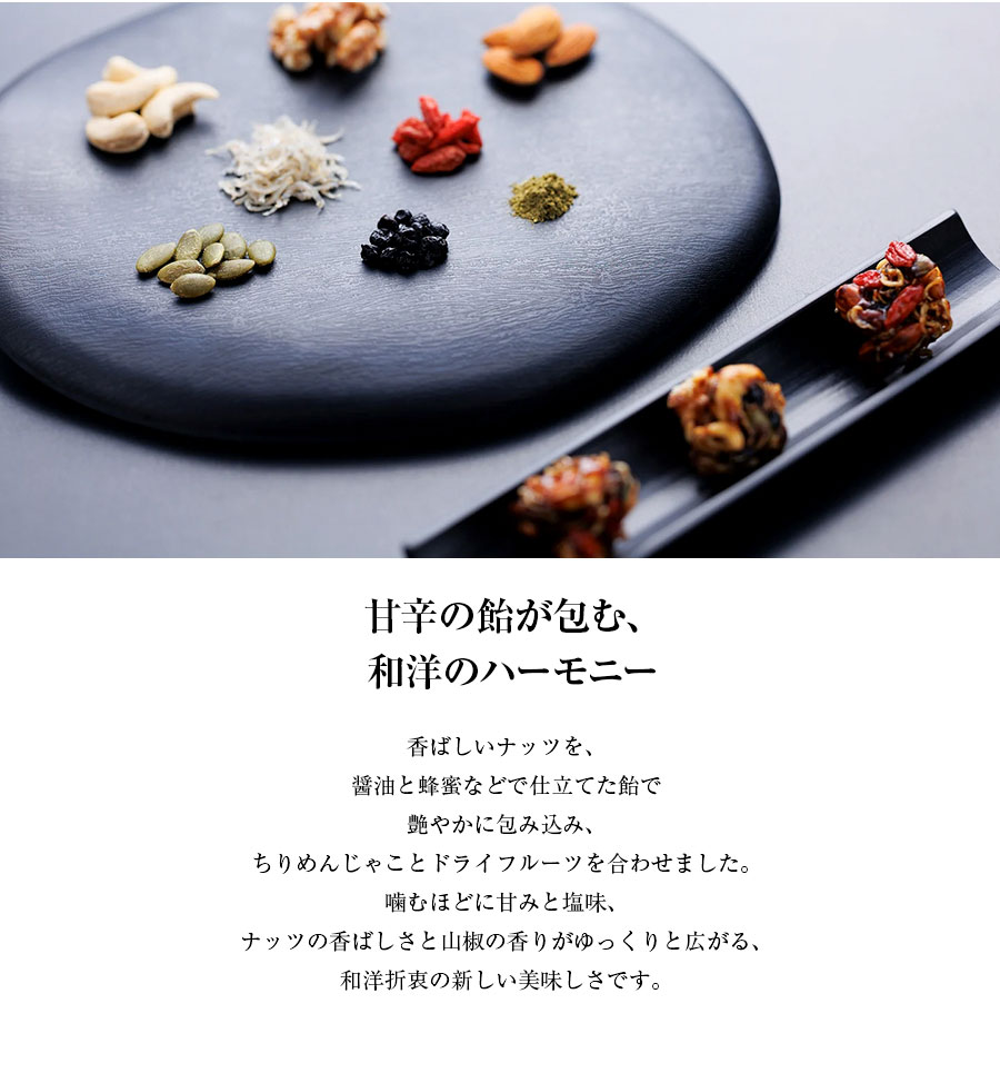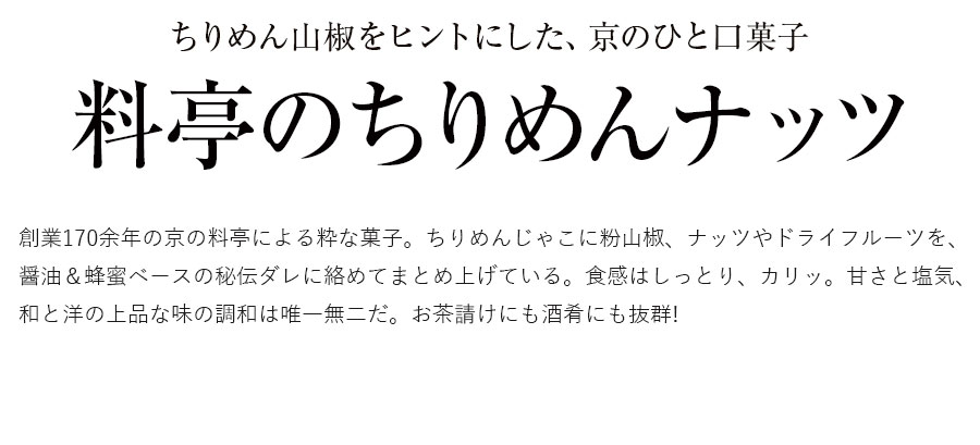 創業170余年の京の料亭による粋な菓子。ちりめんじゃこに粉山椒、ナッツやドライフルーツを、醤油&蜂蜜ベースの秘伝ダレに絡めてまとめ上げている。食感はしっとり、カリッ。甘さと塩気、和と洋の上品な味の調和は唯一無二だ。お茶請けにも酒肴にも抜群!