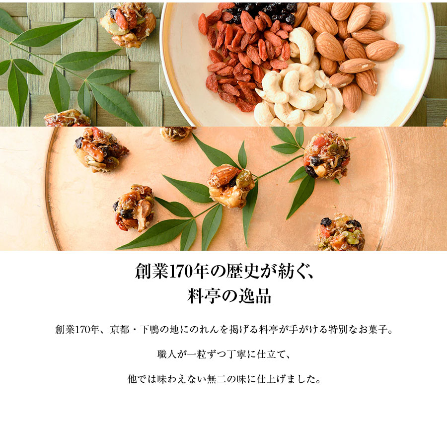 ○名称:菓子 ○内容量:8個入×2 ○原材料名:アーモンド(アメリカ産)、カシューナッツ(インド産)、くるみ(アメリカ産)、ちりめんじゃこ、味付パンプキンシード、クコの実、ブルーベリー糖漬、清酒、みりん、醤油、砂糖、蜂蜜、山椒/酸味料、香料 (一部に、小麦・大豆・アーモンド・カシューナッツ・くるみを含む) ○配送形態:常温 (宅配BOX・置配不可) ○保存方法:常温 ○賞味期限:製造日より30日 ○熨斗:可 ○名入れ:可 ○包装:可 ○手提げ:可(紙袋) ○荷姿:その他 ○備考:【保存方法】 直射日光、高温多湿を避けて保存してください。 開封後は、お早くお召しあがり下さい。 ○製造者:【株式会社下鴨茶寮】 〒601-8106 京都府京都市南区上鳥羽北中ノ坪町23-1 <おすすめ用途> 自宅用 手土産 お年賀 母の日 父の日 お中元 敬老の日 お歳暮 バレンタイン ホワイトデー ギフト プレゼント 贈り物 贈答 お礼 お返し ご挨拶 結婚祝 出産祝 内祝い 誕生日 入学 卒業 <贈る相手> 女性 男性 友人 家族 祖母 祖父 孫