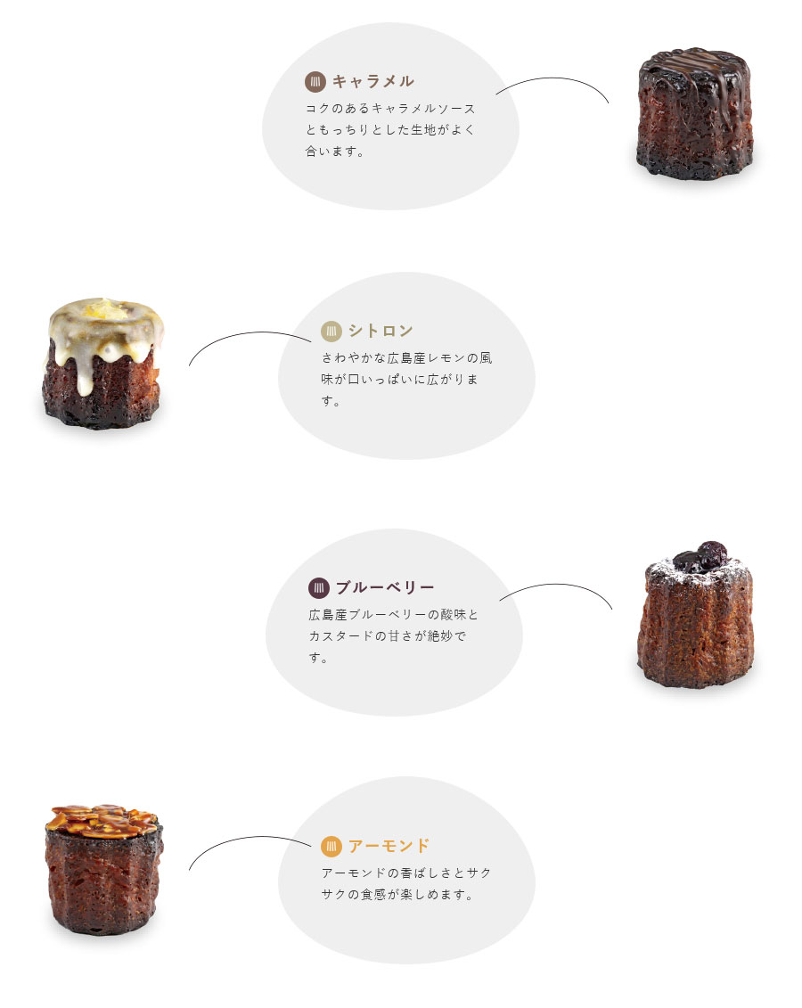 【キャラメルカヌレ】牛乳(国内製造)、生クリーム、砂糖、卵、小麦粉、バター、チョコレート、塩、(一部に卵・小麦・乳成分・大豆を含む)