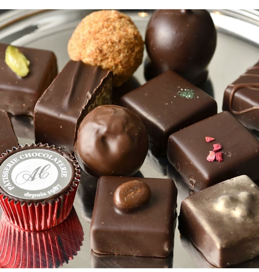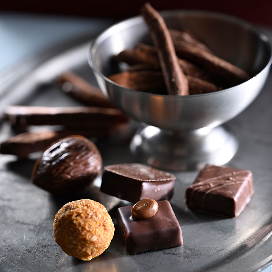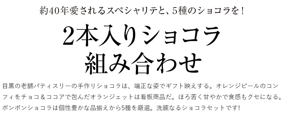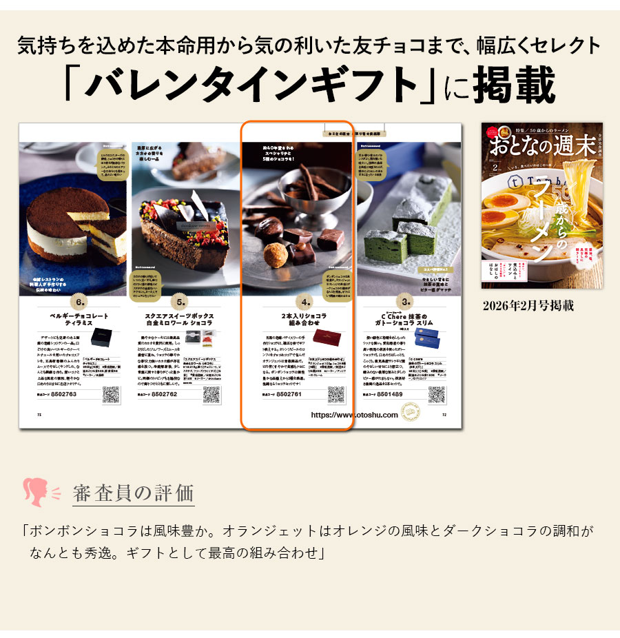 目黒の老舗パティスリーの手作りショコラは、端正な姿でギフト映えする。オレンジピールのコンフィをチョコ&ココアで包んだオランジェットは看板商品だ。ほろ苦く甘やかで食感もクセになる。ボンボンショコラは個性豊かな品揃えから5種を厳選。洗練なるショコラセットです!