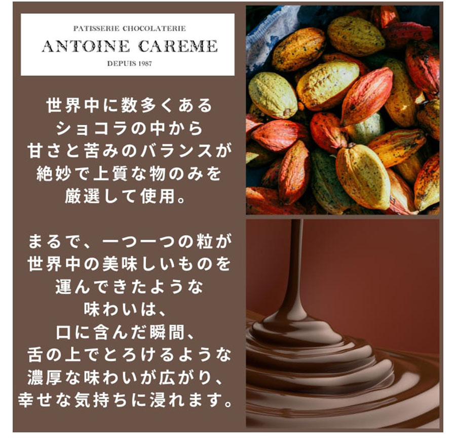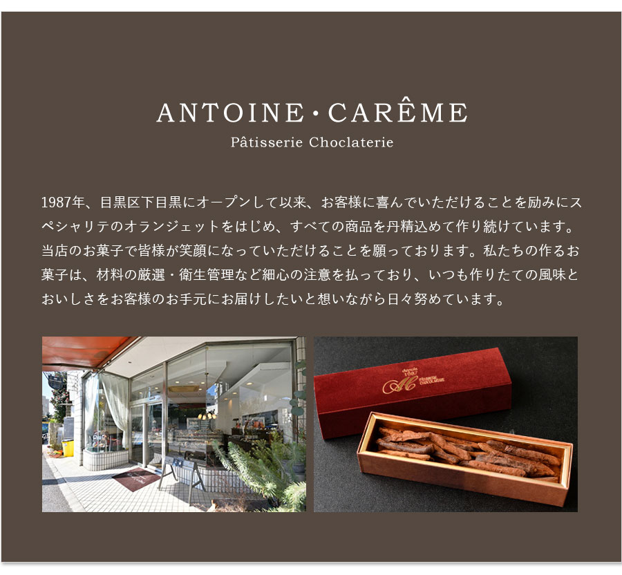 ○名称:チョコレート ○内容量:オランジェット100g、ボンボンショコラ5個 ○原材料名:【オランジェット】オレンジ砂糖漬け(国内製造)、チョコレート、ココアパウダー/香料(一部に乳成分・オレンジ・大豆を含む) 【ボンボンショコラ】チョコレート(大豆を含む)、生クリーム、ピュレ、ナッツ、洋酒、転化糖、(一部に乳成分、くるみ、アーモンド、オレンジ、大豆を含む) ○配送形態:冷蔵 (宅配BOX・置配不可) ○保存方法:冷蔵 ○賞味期限:製造日より冷蔵20日 ○熨斗:可 ○名入れ:可 ○包装:可 ○手提げ:可(紙袋) ○荷姿:ダンボール ○備考: ○販売者:【アントワーヌカレーム】 〒153-0064 東京都目黒区下目黒6-1-27 ○製造者:【有限会社アントワーヌ・カレーム】 〒153-0064 東京都目黒区下目黒6-1-27 <おすすめ用途> 自宅用 手土産 お年賀 母の日 父の日 お中元 敬老の日 お歳暮 バレンタイン ホワイトデー ギフト プレゼント 贈り物 贈答 お礼 お返し ご挨拶 結婚祝 出産祝 内祝い 誕生日 入学 卒業 <贈る相手> 女性 男性 友人 家族 祖母 祖父 孫