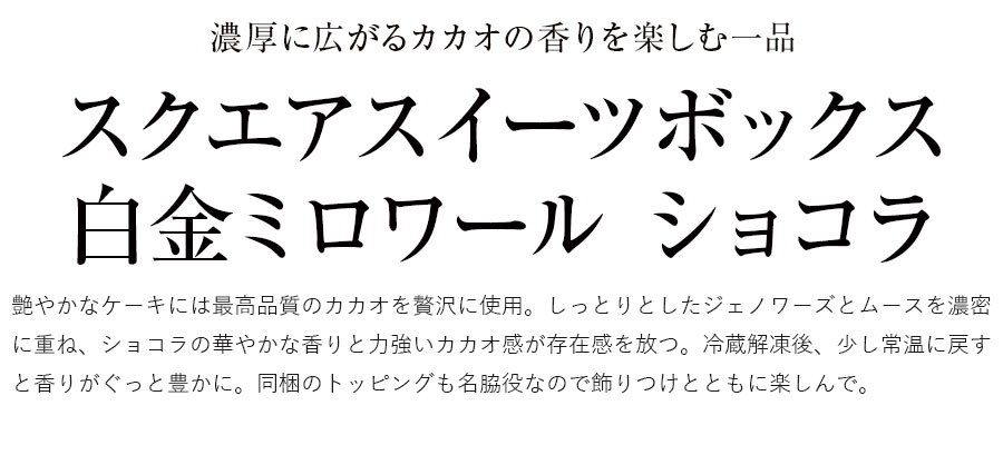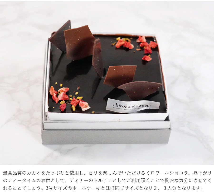 ○名称:白金ミロワールショコラ スクエア ○内容量:1台 ○原材料名:<ミロワール>生クリーム(国内製造)、砂糖、牛乳、チョコレート、卵、ナパージュ、ロイヤルティーヌ、小麦粉、ミルクチョコレート、加糖卵黄、ココアパウダー、コーヒー濃縮エキス、ココアバター、無塩バター、ゼラチン、水飴/トレハロース、乳化剤、ソルビトール、ゲル化剤(増粘多糖類)、pH調整剤、乳酸Ca、パプリカ色素、カラメル色素、香料、グリシン、酸味料、ビタミンC、金箔、(一部に乳成分・大豆・卵・小麦・ゼラチンを含む) <飾り>チョコレート(国内製造)、ピスタチオ、フリーズドライイチゴ/乳化剤、金箔、(一部に乳成分・大豆を含む) ○配送形態:冷凍 (宅配BOX・置配不可) ○保存方法:冷凍 ○賞味期限:出荷日より冷凍14日 ○熨斗:不可 ○名入れ:不可 ○包装:不可 ○手提げ:不可 ○荷姿:ダンボール ○備考: ○販売者:【shirokane sweets TOKYO】 〒108-0072 東京都港区白金5-12-17 ○製造者:【株式会社チェントロカミーノ】 〒108-0072 東京都港区白金5-12-17 <おすすめ用途> 自宅用 手土産 お年賀 母の日 父の日 お中元 敬老の日 お歳暮 バレンタイン ホワイトデー ギフト プレゼント 贈り物 贈答 お礼 お返し ご挨拶 結婚祝 出産祝 内祝い 誕生日 入学 卒業 <贈る相手> 女性 男性 友人 家族 祖母 祖父 孫