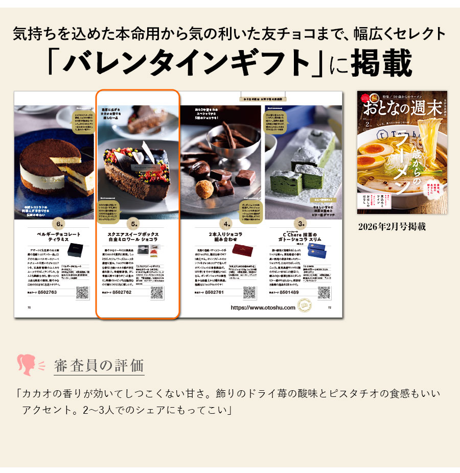艶やかなケーキには最高品質のカカオを贅沢に使用。しっとりとしたジェノワーズとムースを濃密に重ね、ショコラの華やかな香りと力強いカカオ感が存在感を放つ。冷蔵解凍後、少し常温に戻すと香りがぐっと豊かに。同梱のトッピングも名脇役なので飾りつけとともに楽しんで。