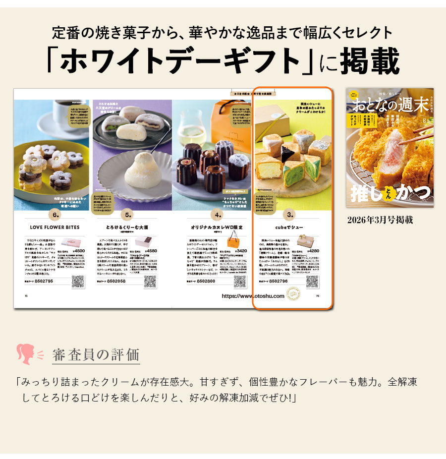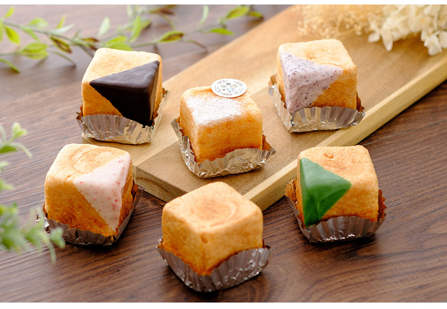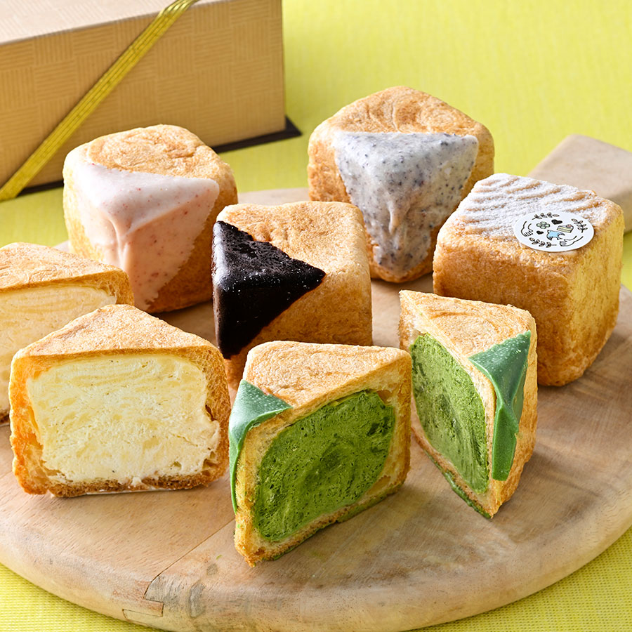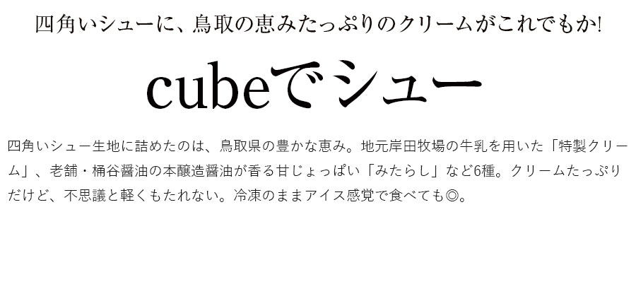 四角いシュー生地に詰めたのは、鳥取県の豊かな恵み。地元岸田牧場の牛乳を用いた「特製クリーム」、老舗・桶谷醤油の本醸造醤油が香る甘じょっぱい「みたらし」など6種。クリームたっぷりだけど、不思議と軽くもたれない。冷凍のままアイス感覚で食べても◎。