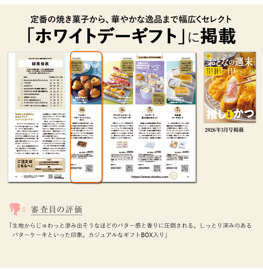愛媛県にある焼き菓子店の一品。少し無骨な姿は手仕事ならではだが、実は香りも味わいも超リッチ。秘密はベルギー産の発酵バターやスペイン産マルコナアーモンドなど最高級素材を贅沢に使っているから。しっとりとした舌触りと芳醇な余韻を楽しめる。