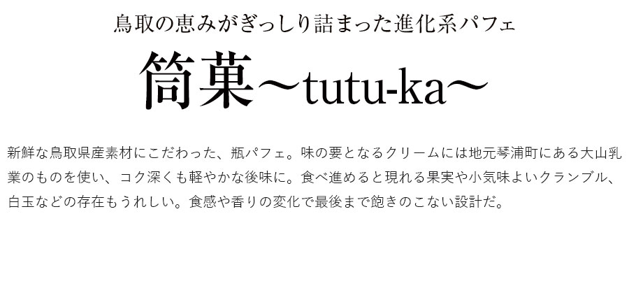 新鮮な鳥取県産素材にこだわった、瓶パフェ。味の要となるクリームには地元琴浦町にある大山乳業のものを使い、コク深くも軽やかな後味に。食べ進めると現れる果実や小気味よいクランブル、白玉などの存在もうれしい。食感や香りの変化で最後まで飽きのこない設計だ。