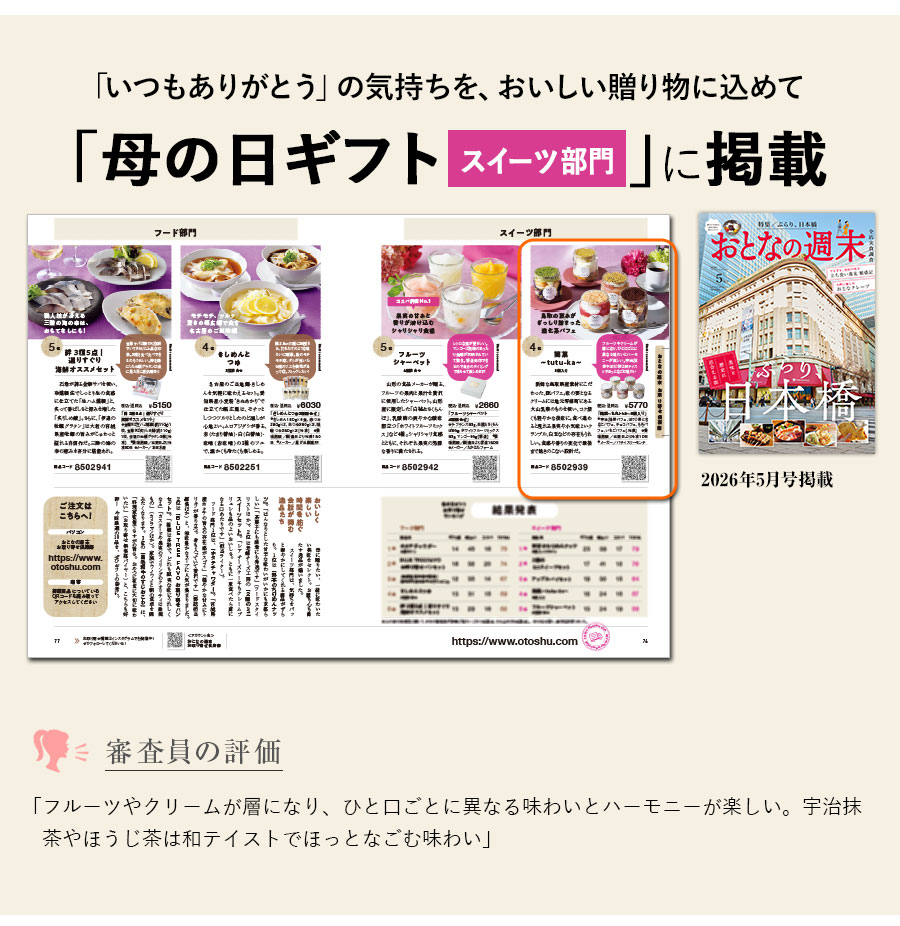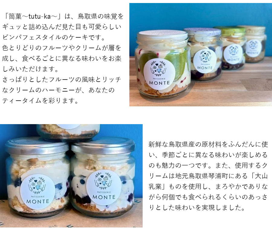 ○名称:冷凍菓子 ○内容量:宇治抹茶パフェ、ほうじ茶ときなこパフェ、チョコパフェ、ももパフェ、いちごパフェ ○原材料名: 【とっておきいちご】 生クリーム(鳥取県製造)、卵、牛乳、いちご、小麦粉、砂糖、水あめ、はちみつ、クリームチーズ、キャラメルアーモンド、レモン果汁、ゼラチン、リキュール/香料、乳化剤 【ほうじ茶】 生クリーム(鳥取県製造)、卵、牛乳、小豆、砂糖、白玉、小麦粉、ココアパウダー、水あめ、はちみつ、クリームチーズ、ほうじ茶、リキュール、レモン果汁、ゼラチン/香料、着色料、乳化剤 【宇治抹茶】 生クリーム(鳥取県製造)、卵、牛乳、小豆、砂糖、小麦粉、水あめ、はちみつ、クリームチーズ、抹茶、リキュール、レモン果汁、ゼラチン/香料、着色料(クチナシ)、乳化剤 【もも】 生クリーム(鳥取県製造)、卵、牛乳、白桃、黄桃、小麦粉、砂糖、水あめ、はちみつ、クリームチーズ、キャラメルアーモンド、レモン果汁、ゼラチン、リキュール/香料、乳化剤 【チョコレート】 生クリーム(鳥取県製造)、チョコレート(一部に乳成分含む)、卵、牛乳、小麦粉、砂糖、水あめ、はちみつ、キャラメルアーモンド、ゼラチン、リキュール/香料、乳化剤 ○配送形態:冷凍 (宅配BOX・置配不可) ○保存方法:冷凍 ○賞味期限:出荷日より冷凍10日 ○熨斗:不可 ○名入れ:不可 ○包装:不可 ○手提げ:可(紙袋) ○荷姿:ダンボール ○備考:お召し上がりの前日に冷蔵庫にいれ、ゆっくり解凍してください。 ○販売者:【パティスリーモンテ】 〒689-2304 鳥取県東伯郡琴浦町逢束500-1東伯ビル1F ○製造者:【パティスリーモンテ】 〒689-2223鳥取県東伯郡北栄町大谷252-1 <おすすめ用途> 自宅用 手土産 お年賀 母の日 父の日 お中元 敬老の日 お歳暮 バレンタイン ホワイトデー ギフト プレゼント 贈り物 贈答 お礼 お返し ご挨拶 結婚祝 出産祝 内祝い 誕生日 入学 卒業 <贈る相手> 女性 男性 友人 家族 祖母 祖父 孫