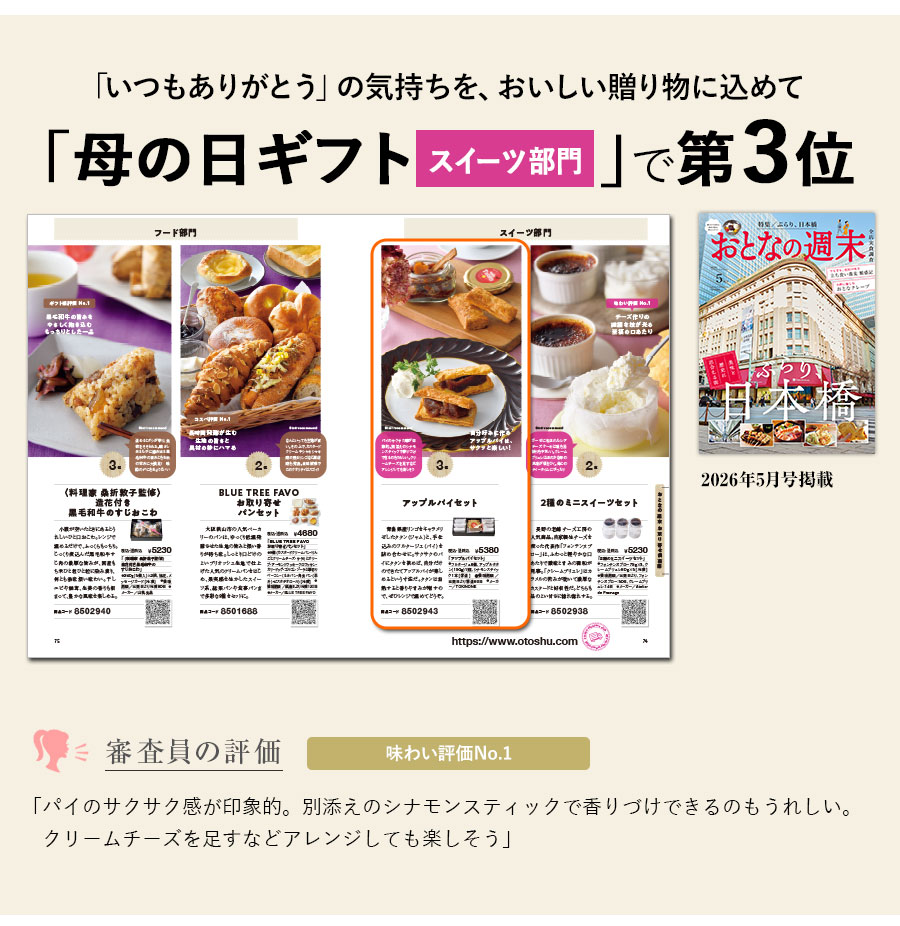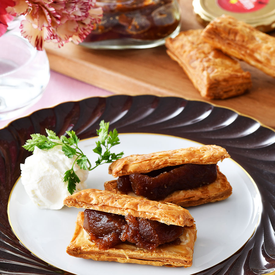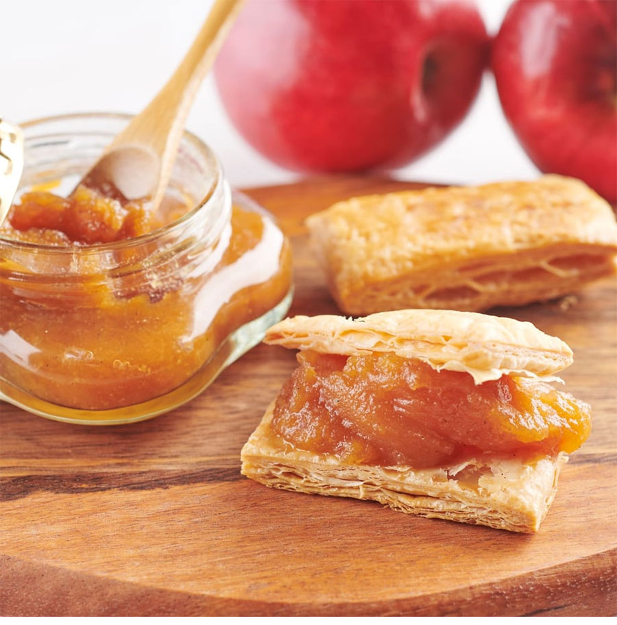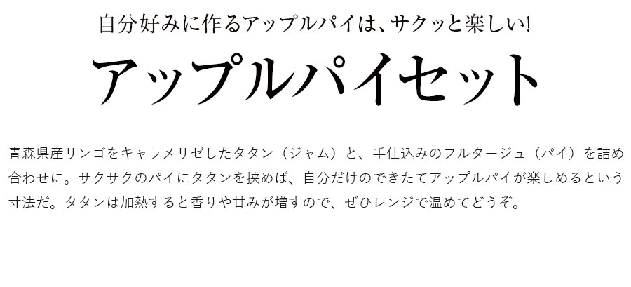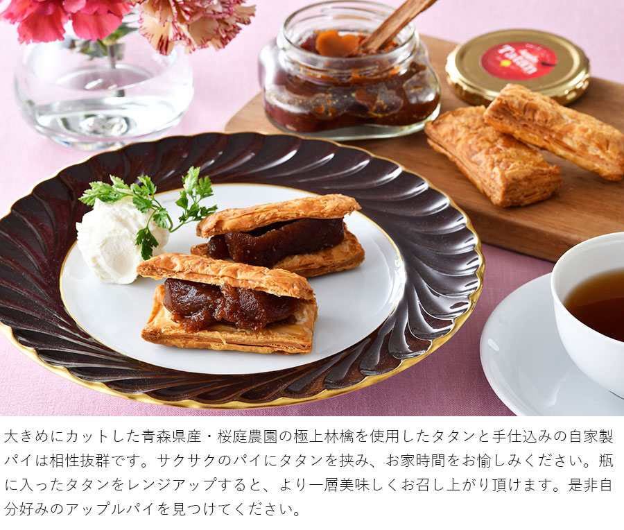 青森県産リンゴをキャラメリゼしたタタン(ジャム)と、手仕込みのフルタージュ(パイ)を詰め合わせに。サクサクのパイにタタンを挟めば、自分だけのできたてアップルパイが楽しめるという寸法だ。タタンは加熱すると香りや甘みが増すので、ぜひレンジで温めてどうぞ。