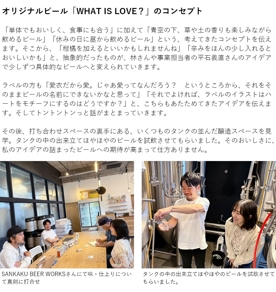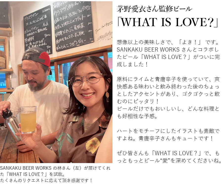 想像以上の美味しさで、「よき!」 です。 SANKAKU BEER WORKS さんとコラボしたビール「WHAT IS LOVE?」がついに完成しました! 原料にライムと青唐辛子を使っていて、爽快感ある味わいと飲み終わった後のちょっとしたアクセントがあり、ゴクゴクっと飲むのにピッタリ!ビールだけでもおいしいし、どんな料理とも好相性な予感。 ハートをモチーフにしたイラストも素敵ですよね。青唐辛子さんもキュートです! ぜひ皆さんも「WHAT IS LOVE?」で、もっともっとビール“愛”を深めてくださいね。 ※本品はクール便送料として別途、1,500円(税込)が必要です。 ※SANKAKU BEER WORKS(鹿児島県)から直送致します。 【お酒は20歳になってから。飲酒運転は法律で禁止されています。お酒は楽しく適量を。妊娠中や授乳期の飲酒はお控えください。】