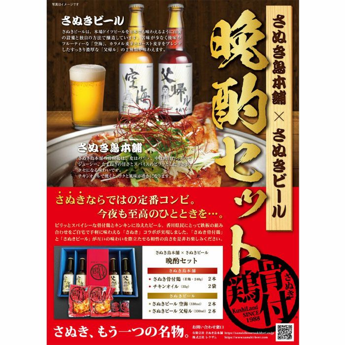 他の画像を見る 晩酌セット さぬきビール×さぬき鳥本舗コラボ 讃岐の魅力が詰まった、骨付鶏とクラフトビールの晩酌セット 晩酌セット さぬきビール×さぬき鳥本舗コラボ 販売価格 ¥ 7,540 税込 ピリッとスパイシーな骨付鶏とキンキンに冷えたビール。さぬきビールの中でも最も讃岐らしい「空海」・「父帰ル」と、うどんに次ぐもう一つの讃岐の名物「さぬき骨付鶏」の晩酌セットです。「空海」は、酸味とほなかな甘み、苦みが少なく、後味にほんのりフルーティーな香りのあるビール、「父帰ル」はカラメル麦芽とロースト麦芽をふんだんに使ったコクがあるのにすっきりとした味わいのビールです。さぬき骨付鶏は、チキンオイルで焼いた旨みたっぷりの骨付鶏を真空パック。玉ねぎの甘さと程よい唐辛子の辛さが特徴でお酒がすすみます。 【お酒は20歳になってから。飲酒運転は法律で禁止されています。お酒は楽しく適量を。妊娠中や授乳期の飲酒はお控えください。】 詳細を見る お気に入りに登録する