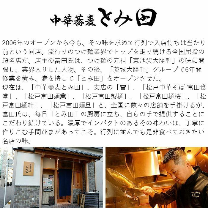 他の画像を見る 中華蕎麦とみ田 つけめん(6食) 千葉県松戸の行列店「とみ田」の人気NO.1メニュー 中華蕎麦とみ田 つけめん(6食) 販売価格 ¥ 8,500 税込 千葉県松戸市の有名店「中華蕎麦とみ田」の店で出している「つけめん」のスープ、麺、メンマ、チャーシュー、柚子をそのまま冷凍したセット。濃厚なのに飽きのこない豚骨魚介味のスープは、奥深い旨み。自家製の麺はモチッとしたコシが特徴だ。【講談社TRYラーメンオブザイヤーつけ麺部門8年連続最優秀賞、大つけ麺博2016最優秀賞】 詳細を見る お気に入りに登録する